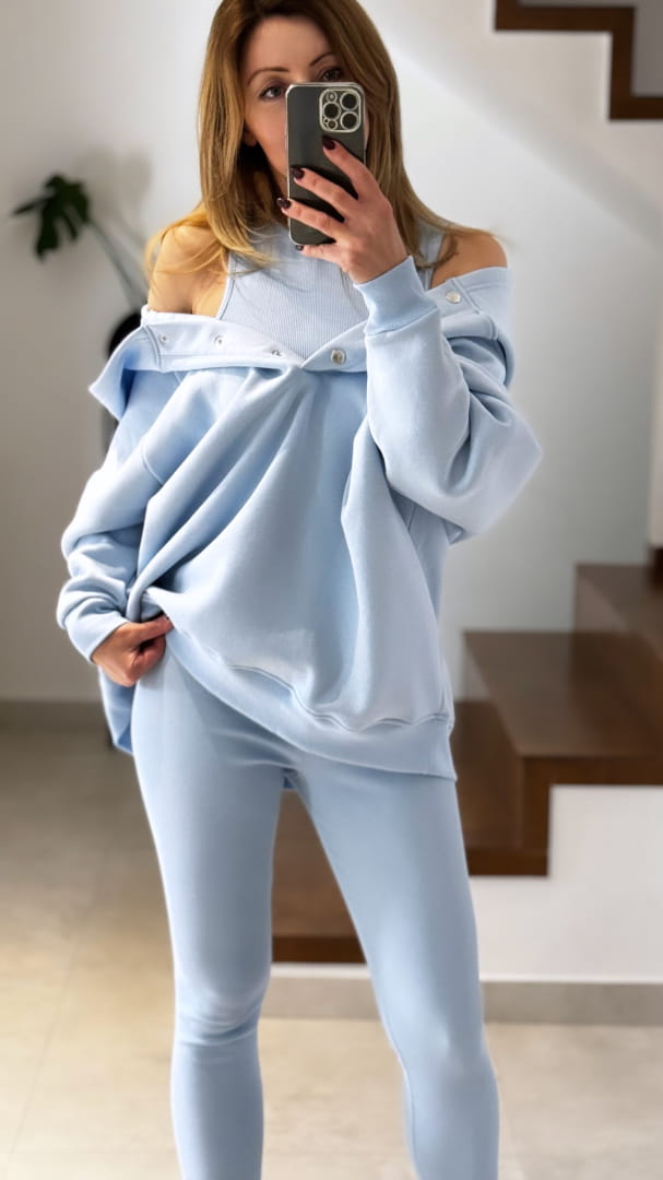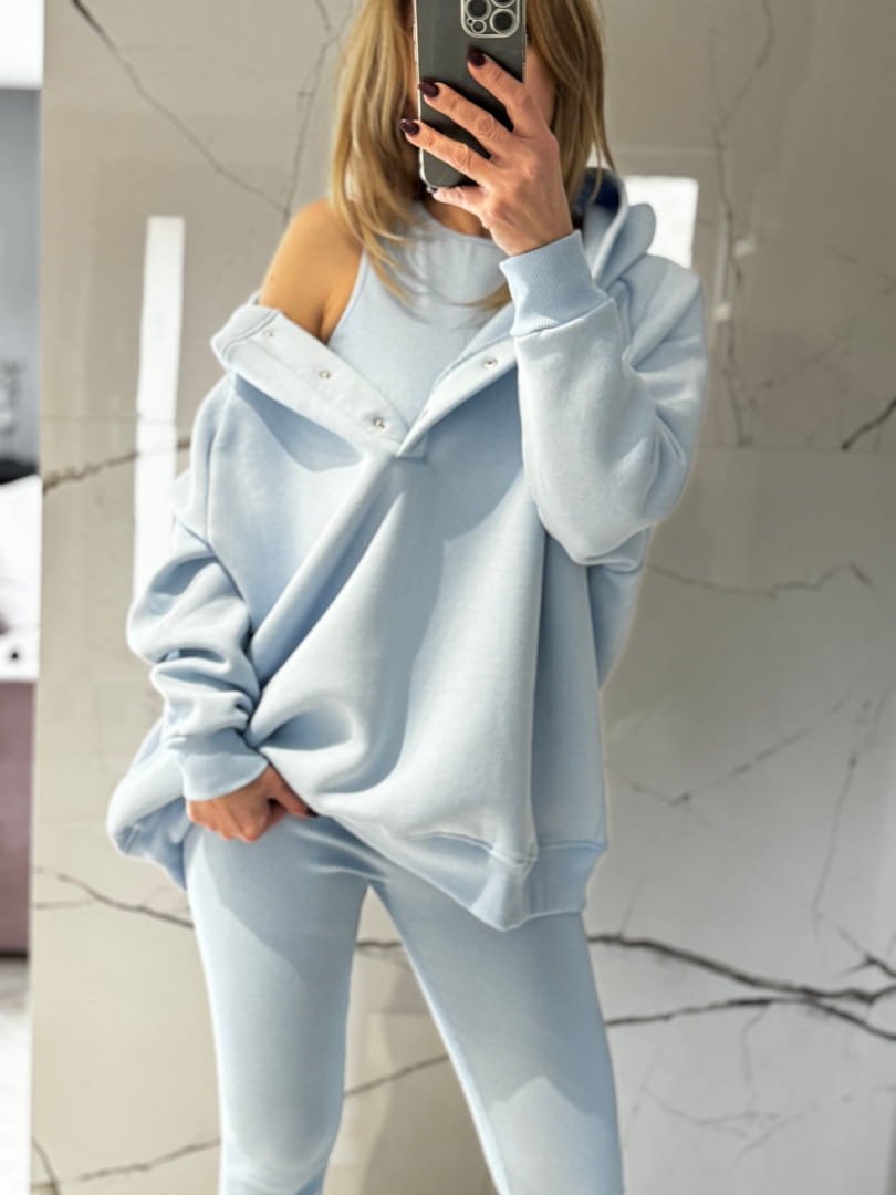 Komplet dresowy Cotts Błękitny 3 częściowy ocieplana bluza z napami oraz kapturem, legginsy prążek oraz top