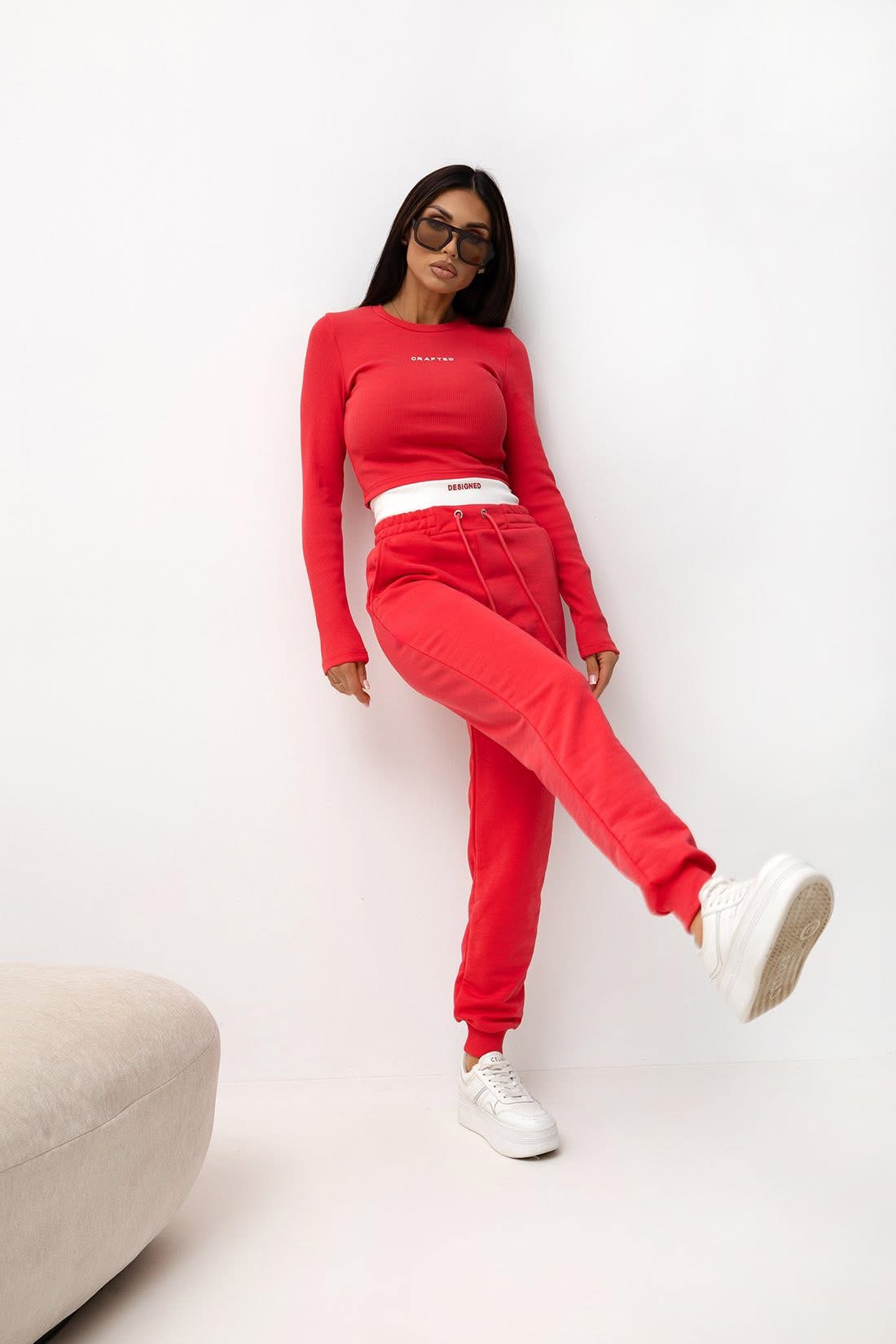 Cudny malinowy kolor w komplecie Crafted . Set dla kobiet ceniących sobie swobodę oraz ekstrawagancję .Dopasowany top z prążkowanej elastycznej bawełny z elastanem w zestawieniu z spodniami dresowymi z wysokim stanem dodaje sylwetce sexapilu . Spodnie dresowe z wewnętrznymi kieszeniami .