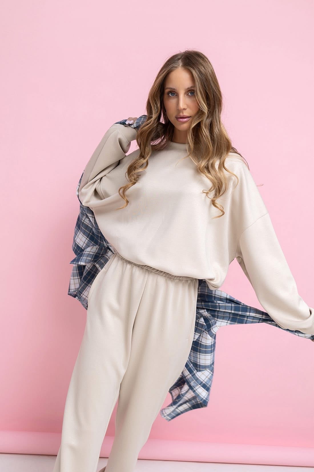 Oversize bluza w beżowe paseczki komplet damski „Lenoshka” , „komplet nude” , krata kratka brąz brązowy czekoladowy bordo beż beżowa krata kratka beżowy