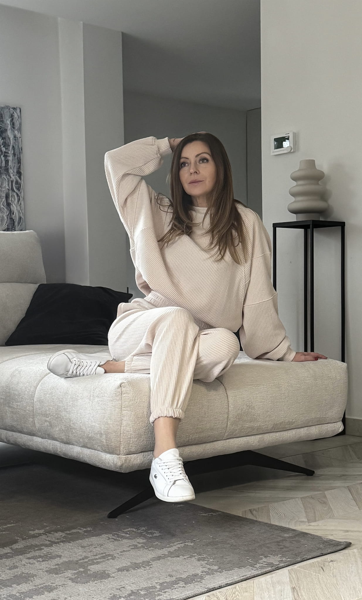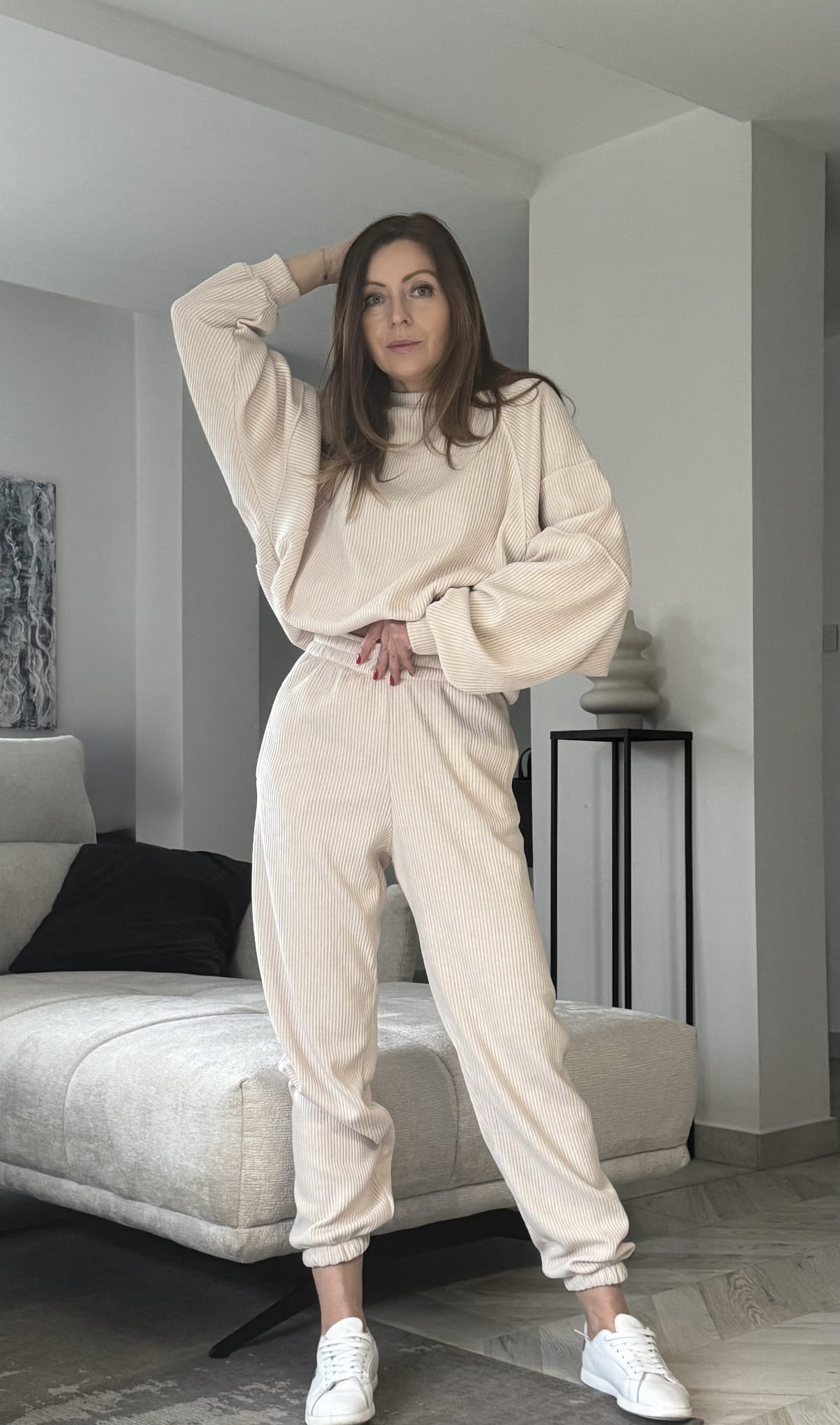 Komplet Wera spodnie dresowe z wysokim stanem oraz bluza z ze ściągaczem w rozmiarze oversize. Bluza typu Basic posiada regulowany troczek . Komplet sztruksowy , mięciutki i bardzo przyjemny .