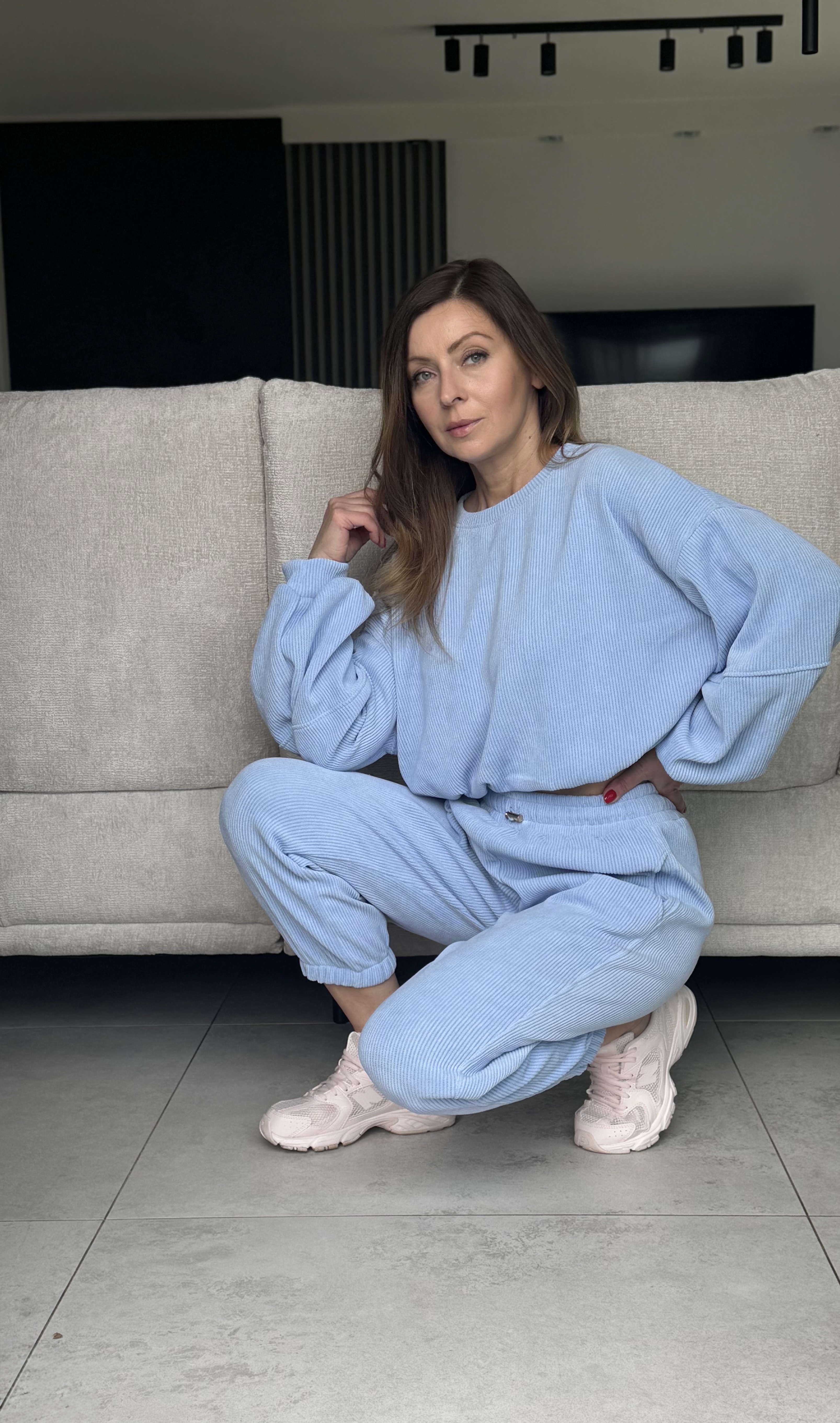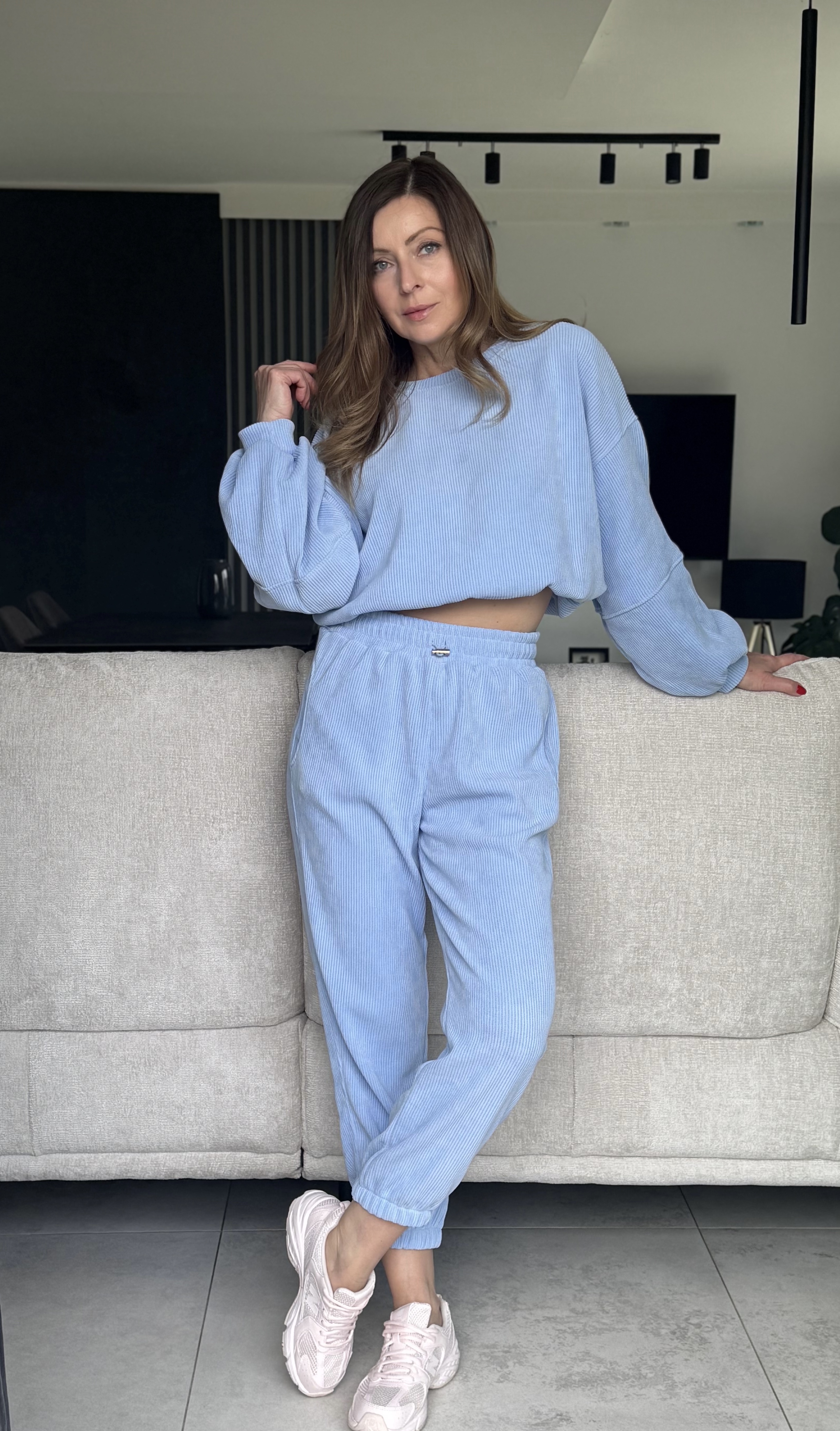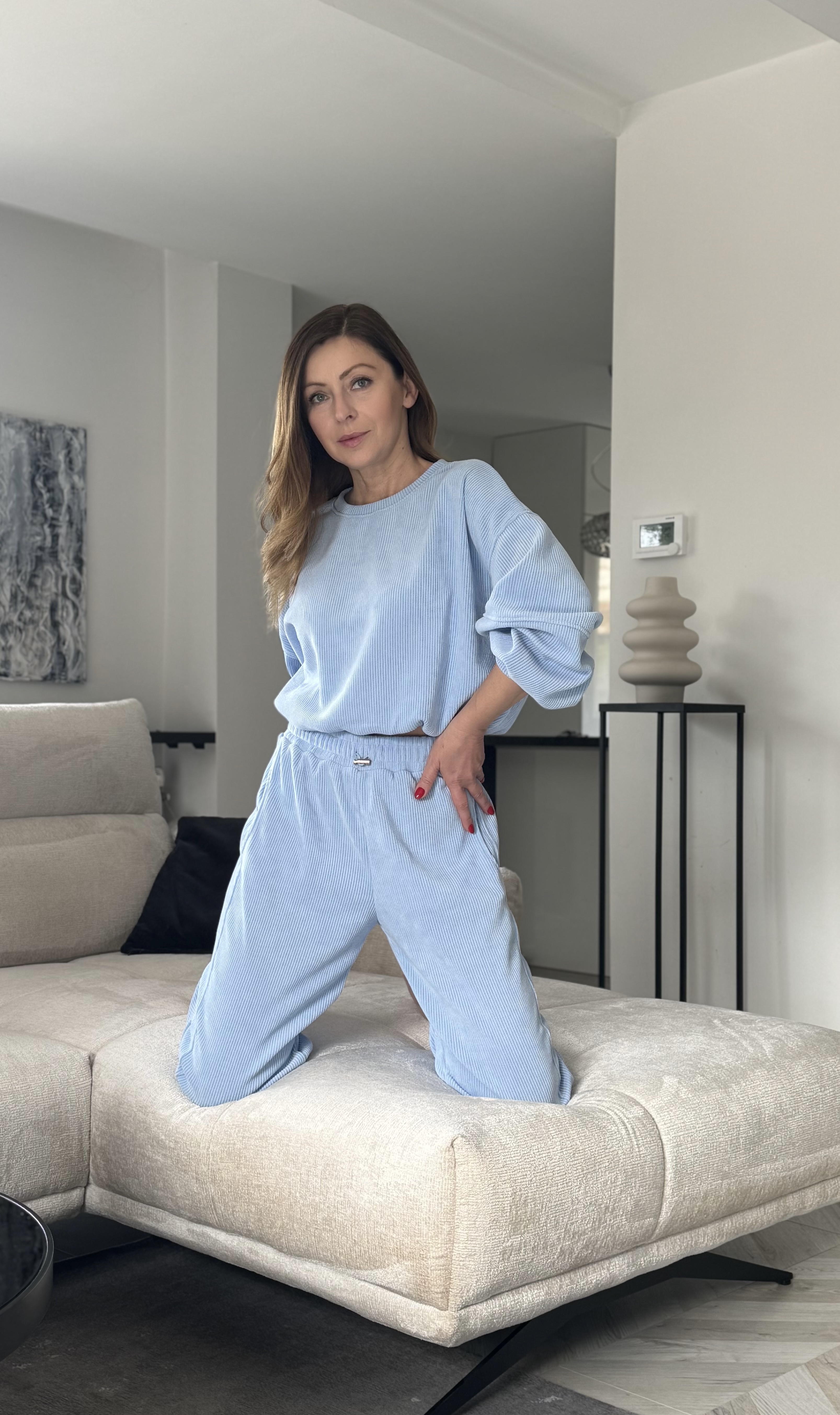 Komplet By Mia spodnie dresowe z wysokim stanem oraz bluza z ze ściągaczem w rozmiarze oversize. Bluza typu Basic posiada regulowany troczek . Komplet sztruksowy , grubszy prążek , mięciutki i bardzo przyjemny .