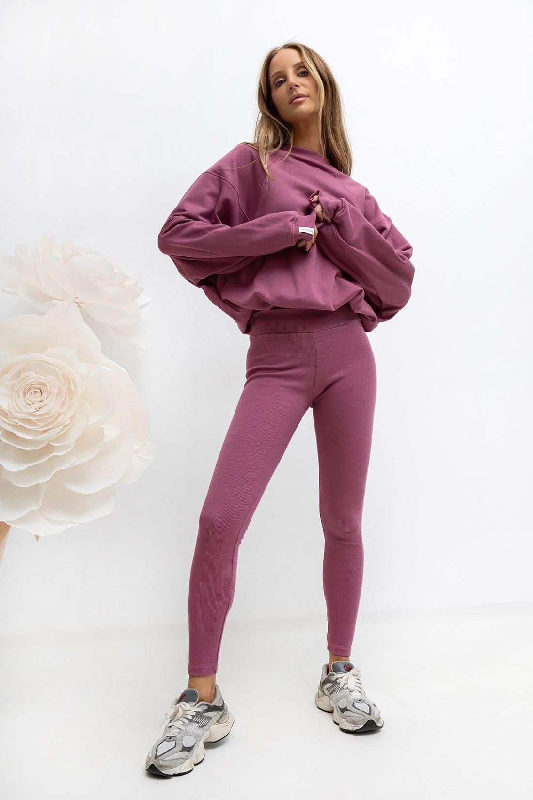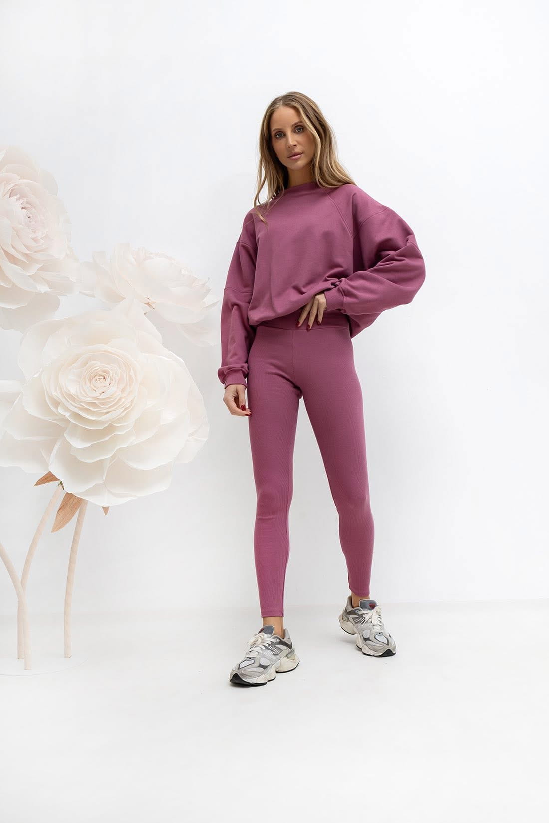 Bluza wykonana z miękkiej dzianiny, wykończona od spodu splotem pętelkowym. Basicowy model, delikatny oversize. Legginsy prążek push up