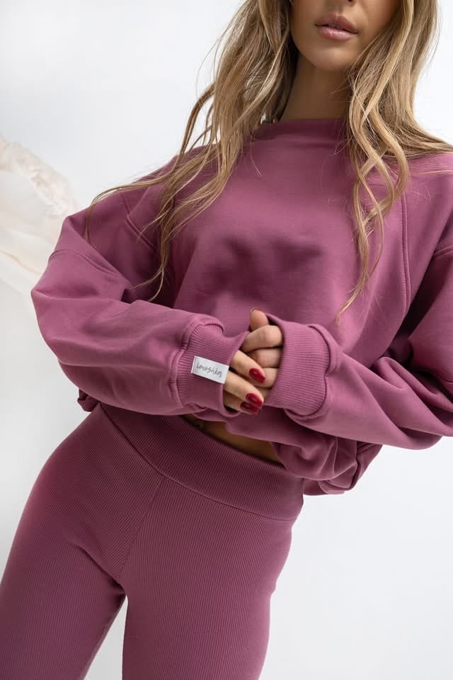 Komplet Bluza nieocieplana oraz legginsy push up prążek .bluza z regulowanym troczkiem na dole . W pięknym jagodowym kolorze. Bluza posiada przeszycie na rękawie .