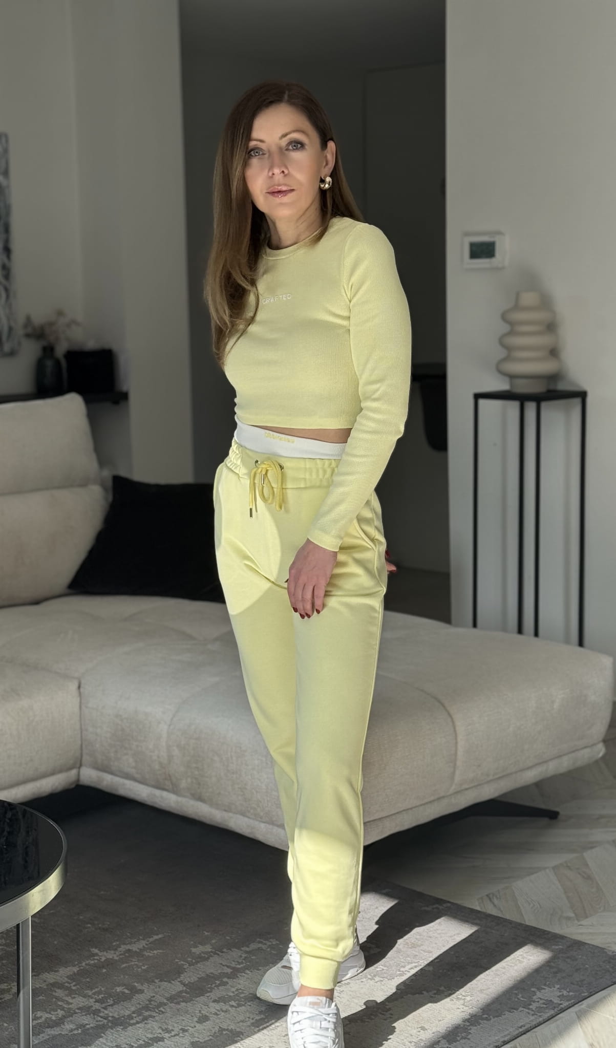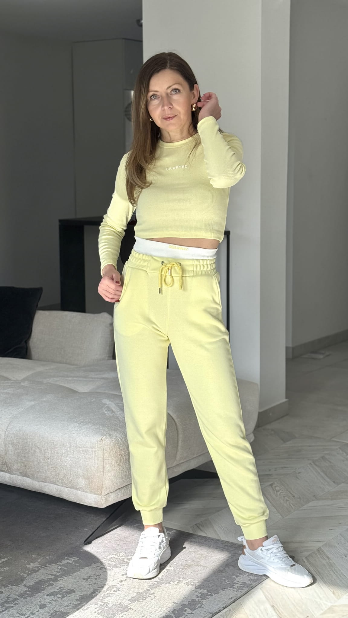 Komplet Crafted to Set dla kobiet ceniących sobie swobodę oraz ekstrawagancję .Dopasowany top z prążkowanej elastycznej bawełny z elastanem w zestawieniu z spodniami dresowymi z wysokim stanem dodaje sylwetce sexapilu . Spodnie dresowe z wewnętrznymi kieszeniami .