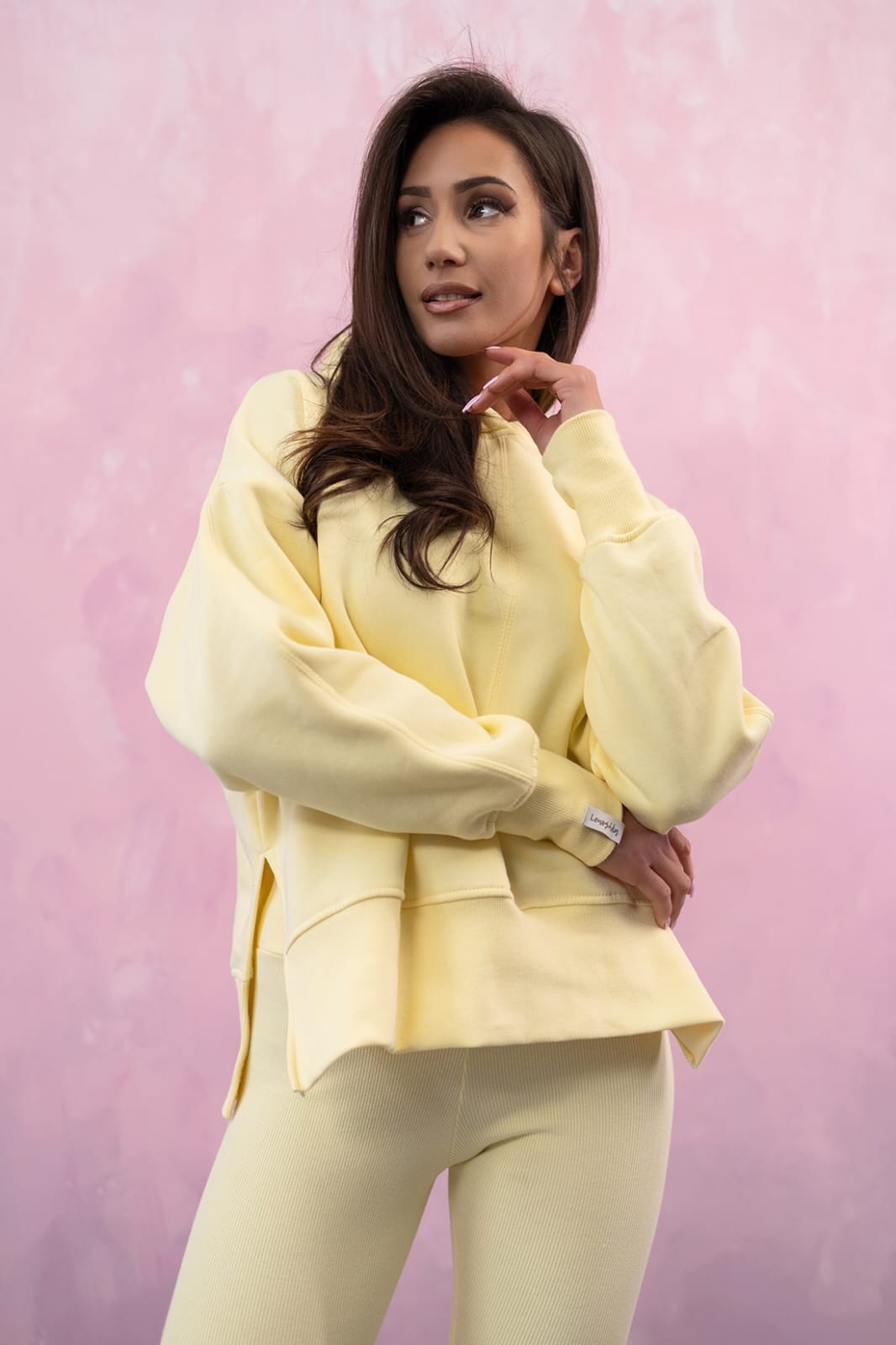 Komplet bluza z legginsami modelującymi kolorze w beżowym wykonana z miękkiej, nieocieplanej dzianiny. Oversizowy fason pozwala na wiele kombinacji outfitowych. Bardzo modne rozcięcia z boku bluzy. Praktyczne wycięcia na kciuk w mankietach. Bluza tworzy idealną podstawę do wielu stylizacji .