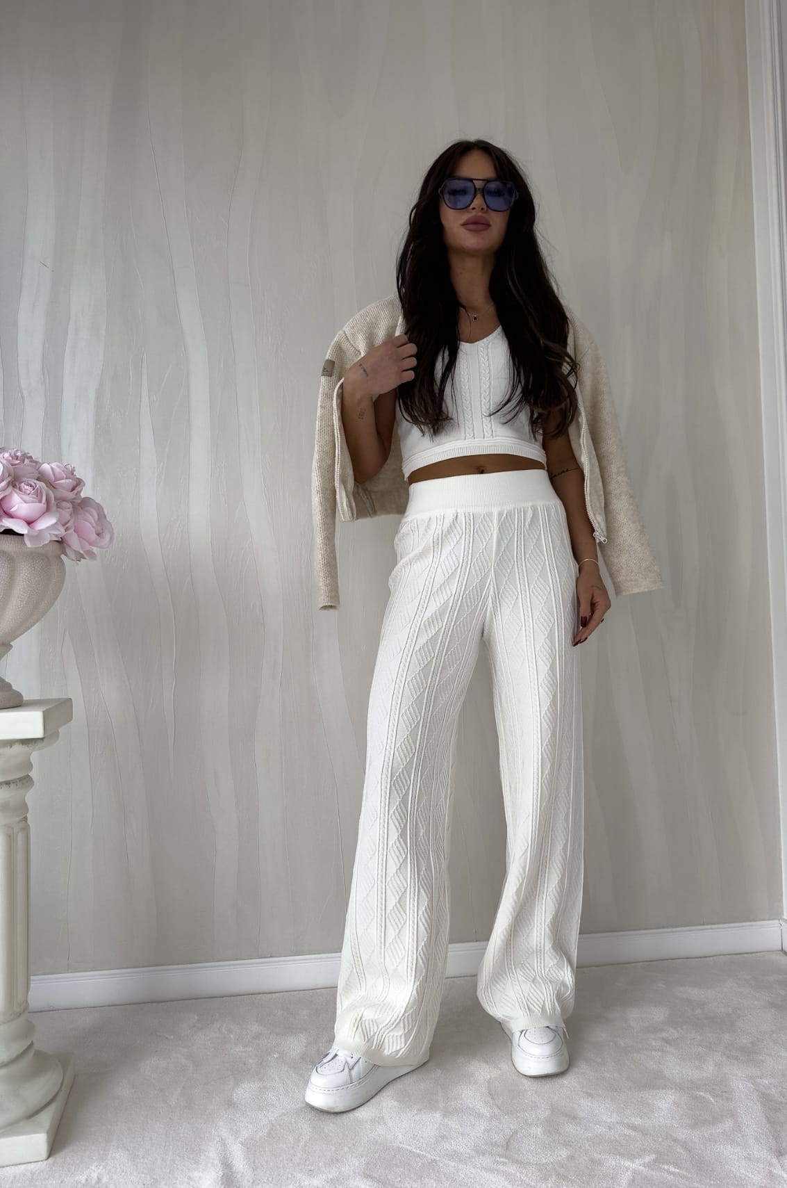 Cudowny zestaw top oraz proste spodnie z dzianinowego materiału z warkoczowym splocie . Bardzo przyjemny i efektowy komplet z dodatkiem kaszmiru .