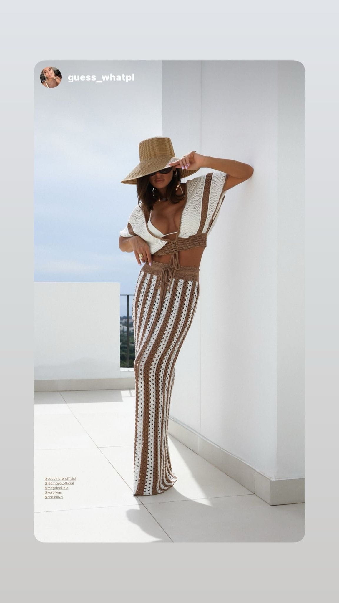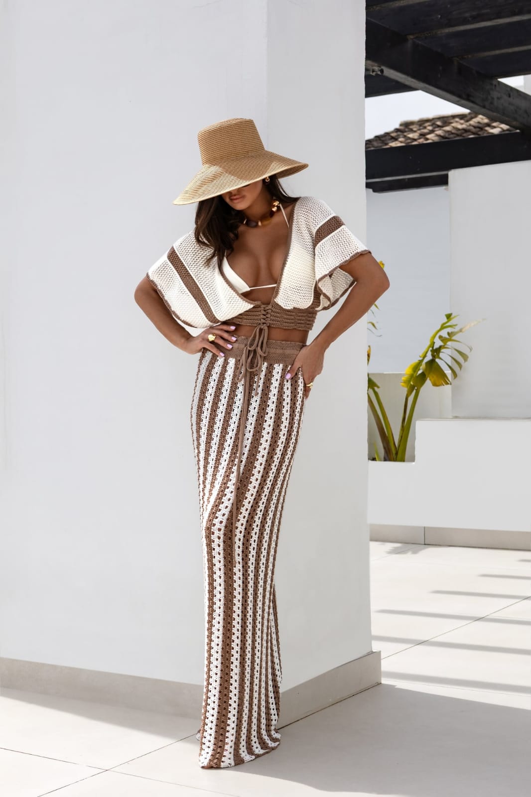 Letnia, szydełkowa spódnica maxi w paski z topem . Wykonane z przewiewnej dzianiny, idealna na wakacyjne dni. Dopasowany fason z wysokim stanem pięknie podkreśla sylwetkę, a wiązanie w talii dodaje stylowego wykończenia. Doskonały wybór na plażę lub letnie wakacyjne wyjścia .Krótka, szydełkowa bluzka w stylu boho z szerokimi rękawami i głębokim dekoltem. Wiązanie z przodu umożliwia regulację dopasowania, a lekka, przewiewna dzianina sprawia, że to idealny wybór na letnie dni i plażowe stylizacje.
