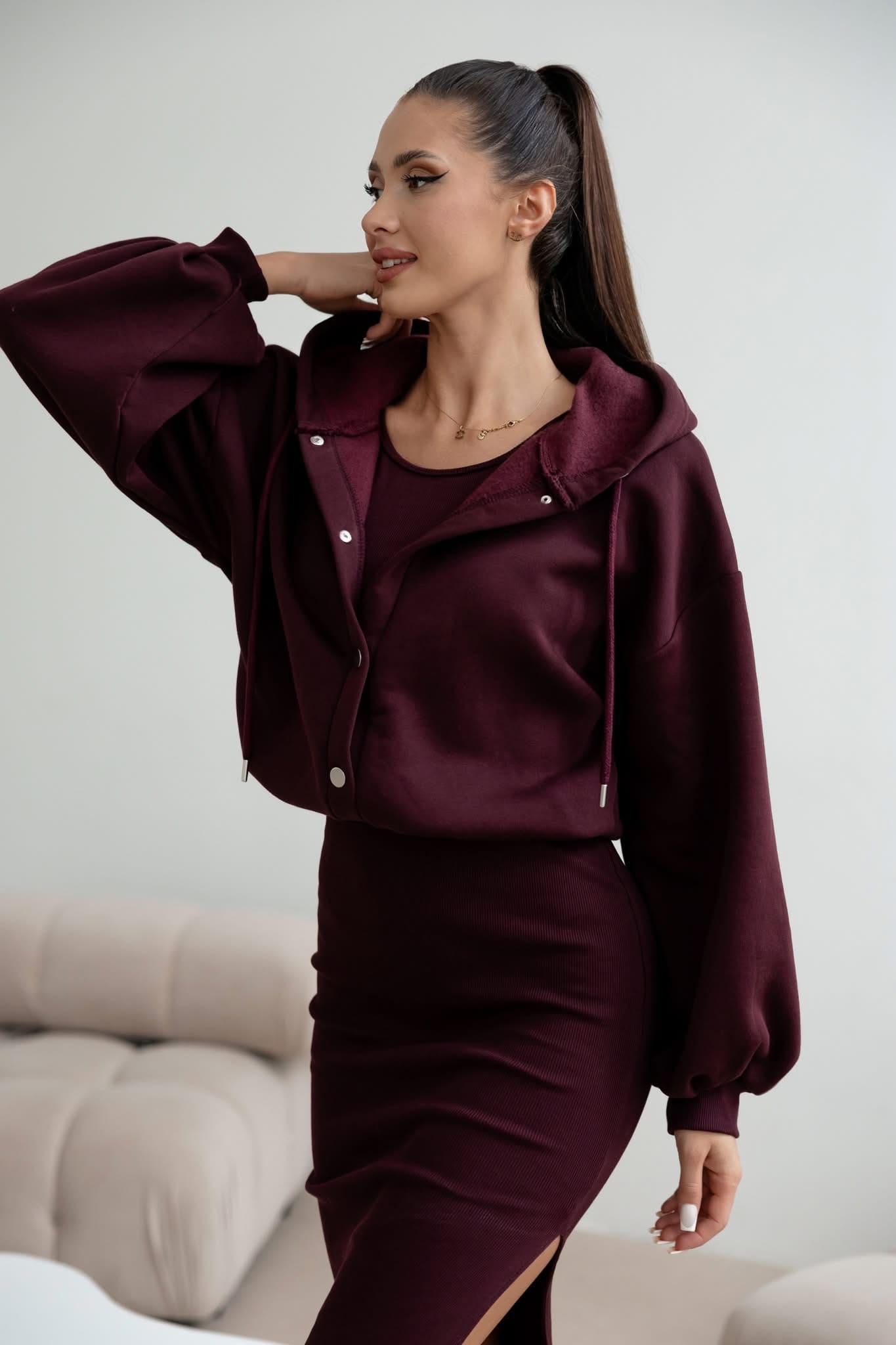 Bluza ocieplana, delikatnie oversizowy fason , z kapturem. Bawełniany materiał prążkowany z którego wykonana jest sukienka jest bardzo elastyczny , dzięki czemu dopasowuje się do każdej sylwetki od XS do XL .Ten Basicowy comfy set można dowolnie wykorzystywać w różnych wariacjach łączyć ze szpilkami , trampkami , do pracy czy na wyjście . W każdym zestawieniu będzie świetnie wyglądał .