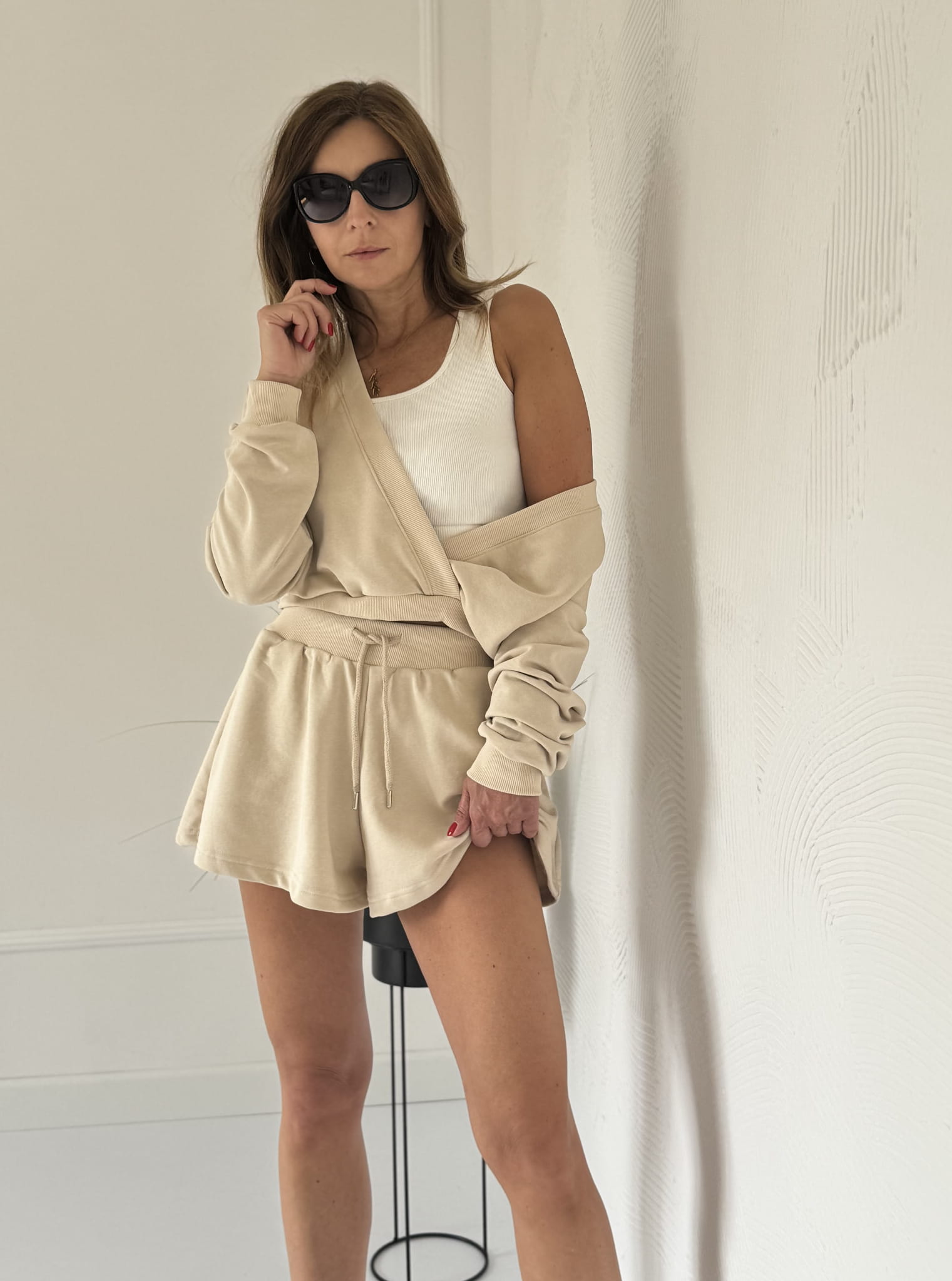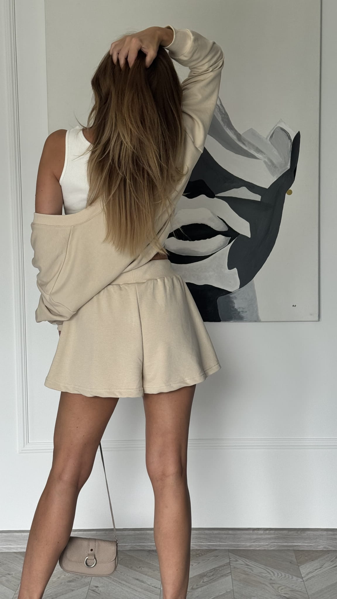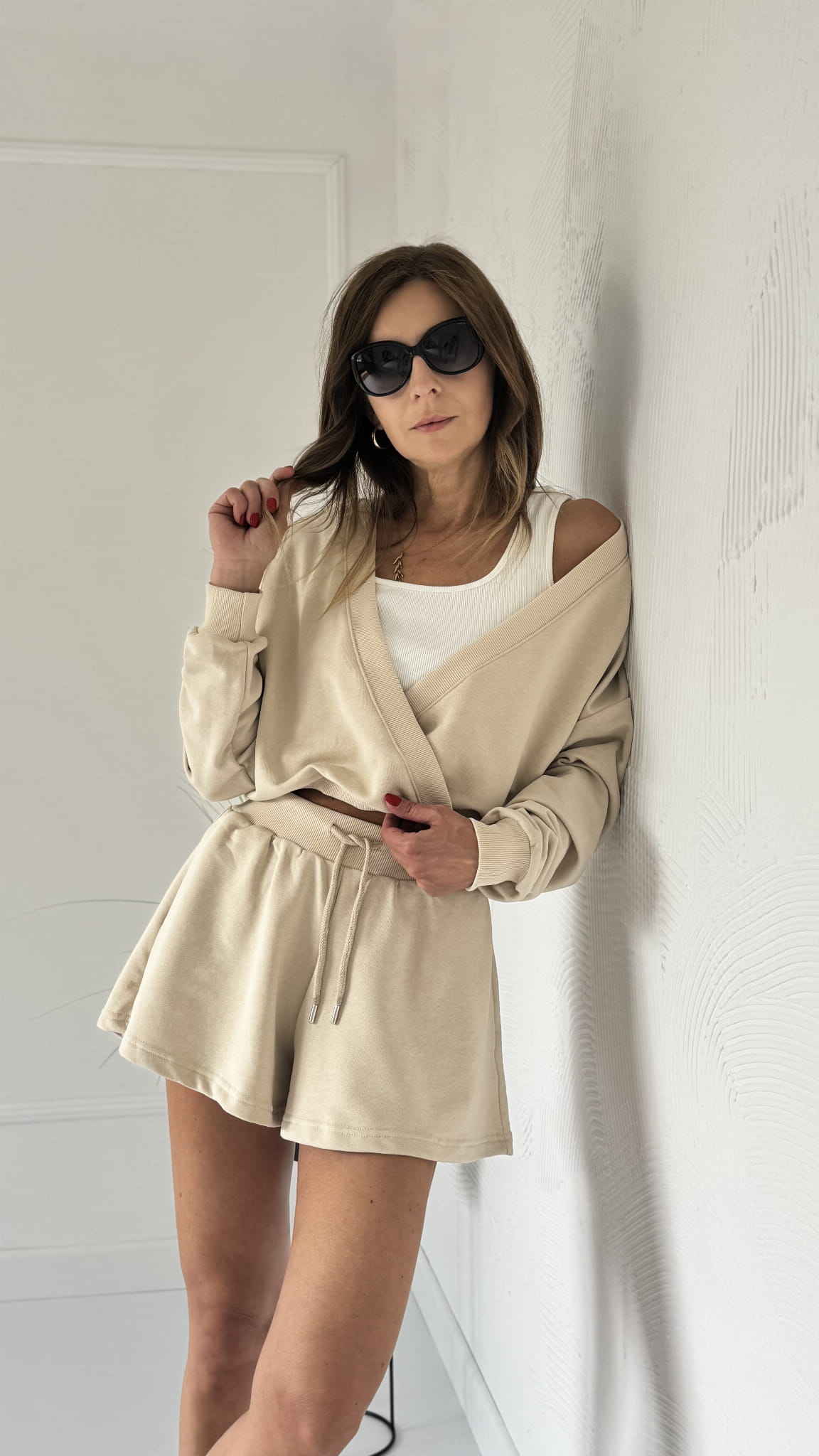 Uroczy komplet Trio wykonany z bawełny z dodatkiem elastynu , idealnego materiału na lato . Top bez rękawków , bluza oraz zwiewne , rozkloszowane spodenki. Rozmiar ONE SIZE, pasuje dla rozmiarów XS, S, M, L.
