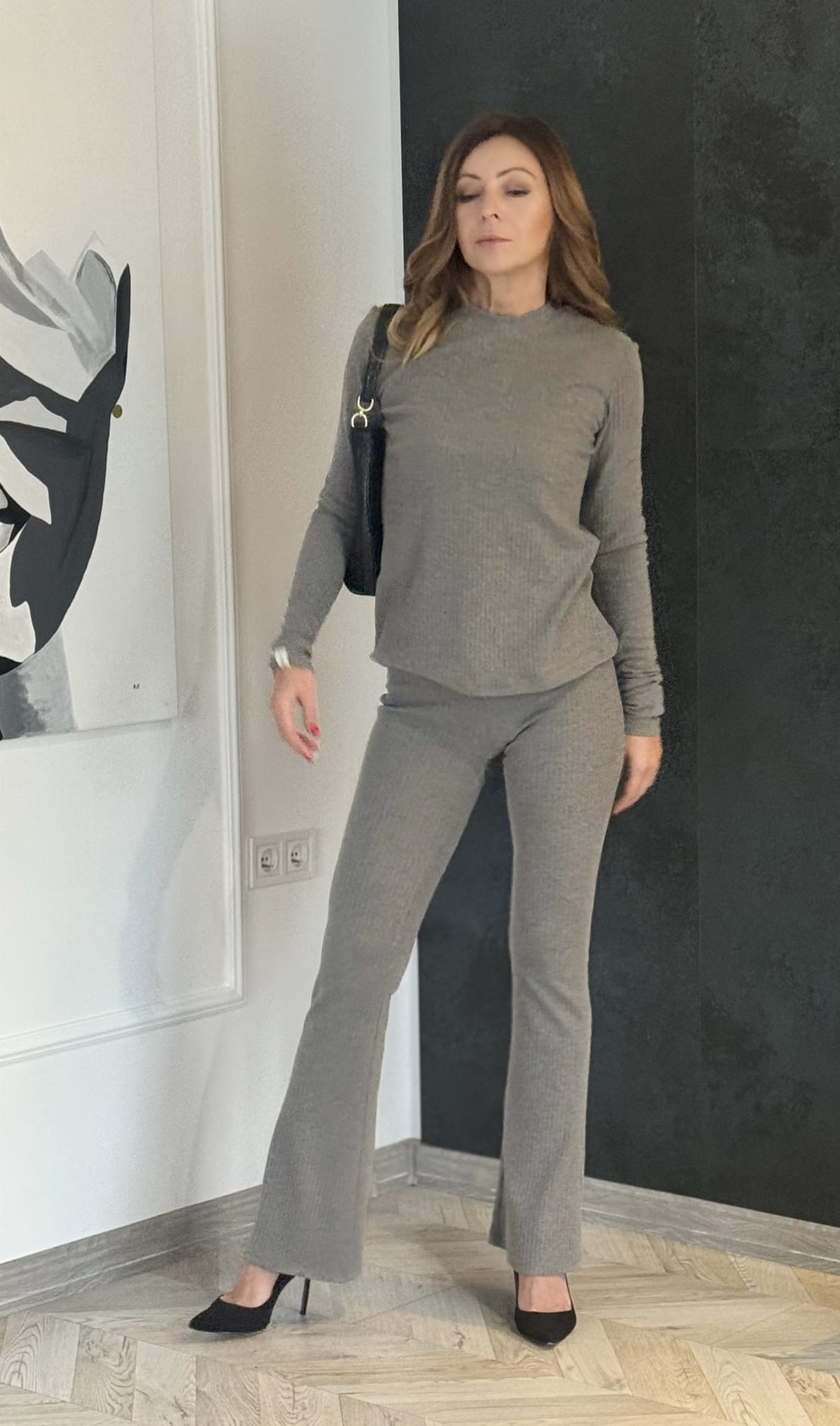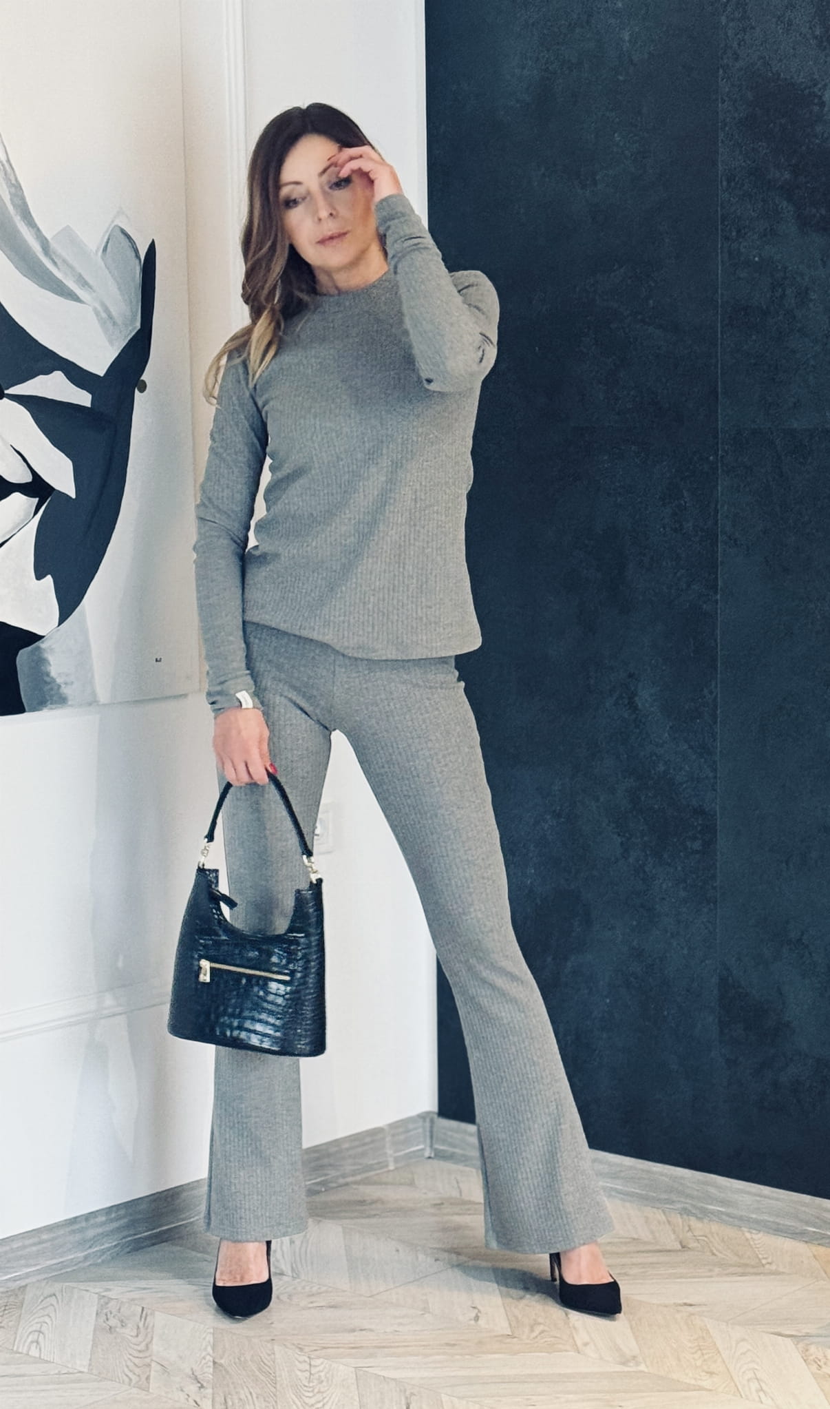 Komplet Westa to zestawienie koszulki z długim rękawem z wycięciem na kciuk oraz legginsów . legginsy z rozszerzaną nogawką typu dzwony grubszy prążek z elastycznej , mocno kryjącej bawełny z elastanem. Komplet idealny jako baza zarówno do marynarki, solo czy najmodniejszych koszul w kratę . Rewelacyjny na szybkie wypady , zajmuje mało miejsca w walizce ☺️ legginsy dzwony wydłużają i wyszczuplają nogi rewelacyjnie.