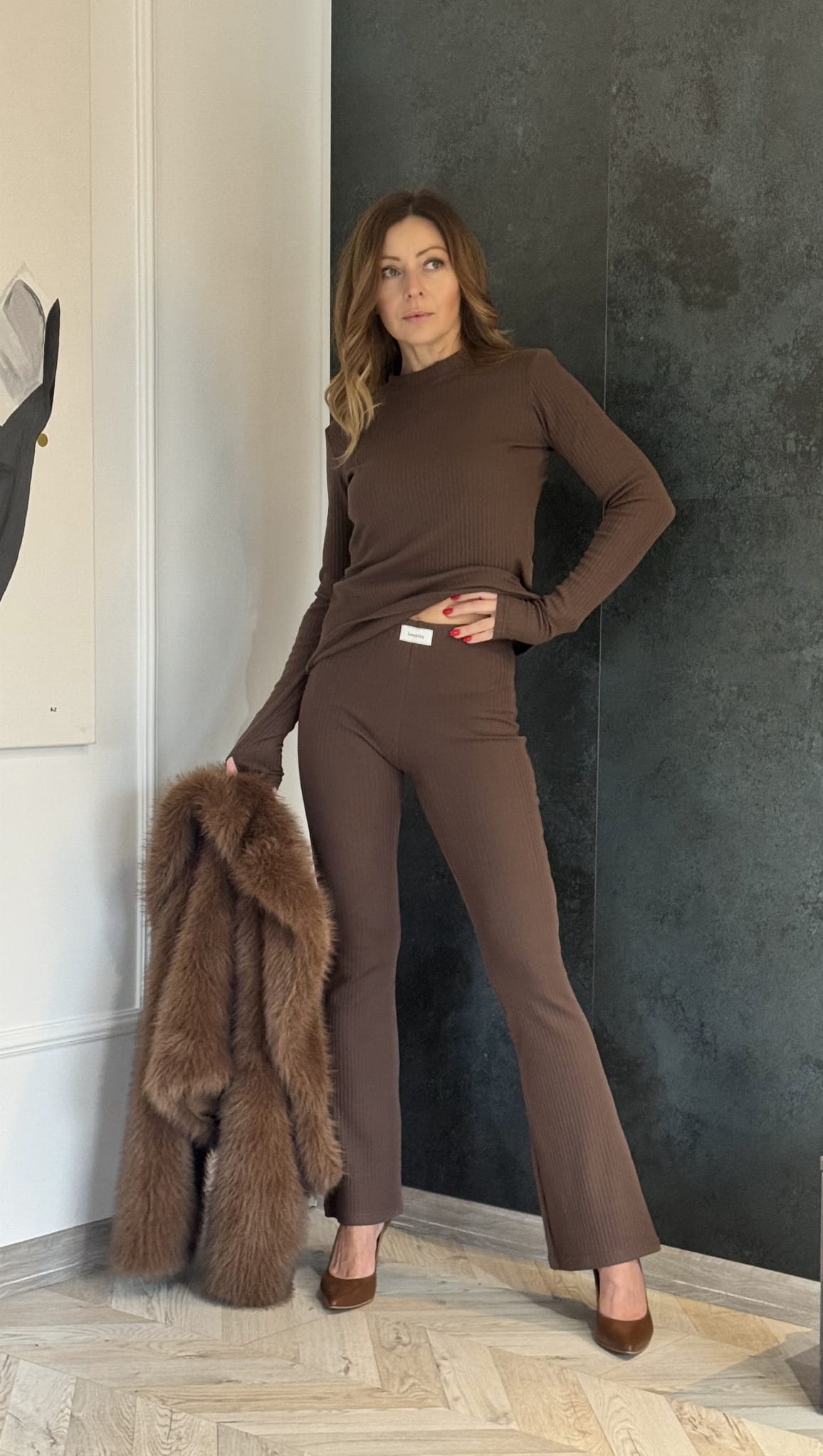 Komplet Westa to zestawienie koszulki z długim rękawem z wycięciem na kciuk oraz legginsów . legginsy z rozszerzaną nogawką typu dzwony grubszy prążek z elastycznej , mocno kryjącej bawełny z elastanem. Komplet idealny jako baza zarówno do marynarki, solo czy najmodniejszych koszul w kratę . Rewelacyjny na szybkie wypady , zajmuje mało miejsca w walizce ☺️ legginsy dzwony wydłużają i wyszczuplają nogi rewelacyjnie.