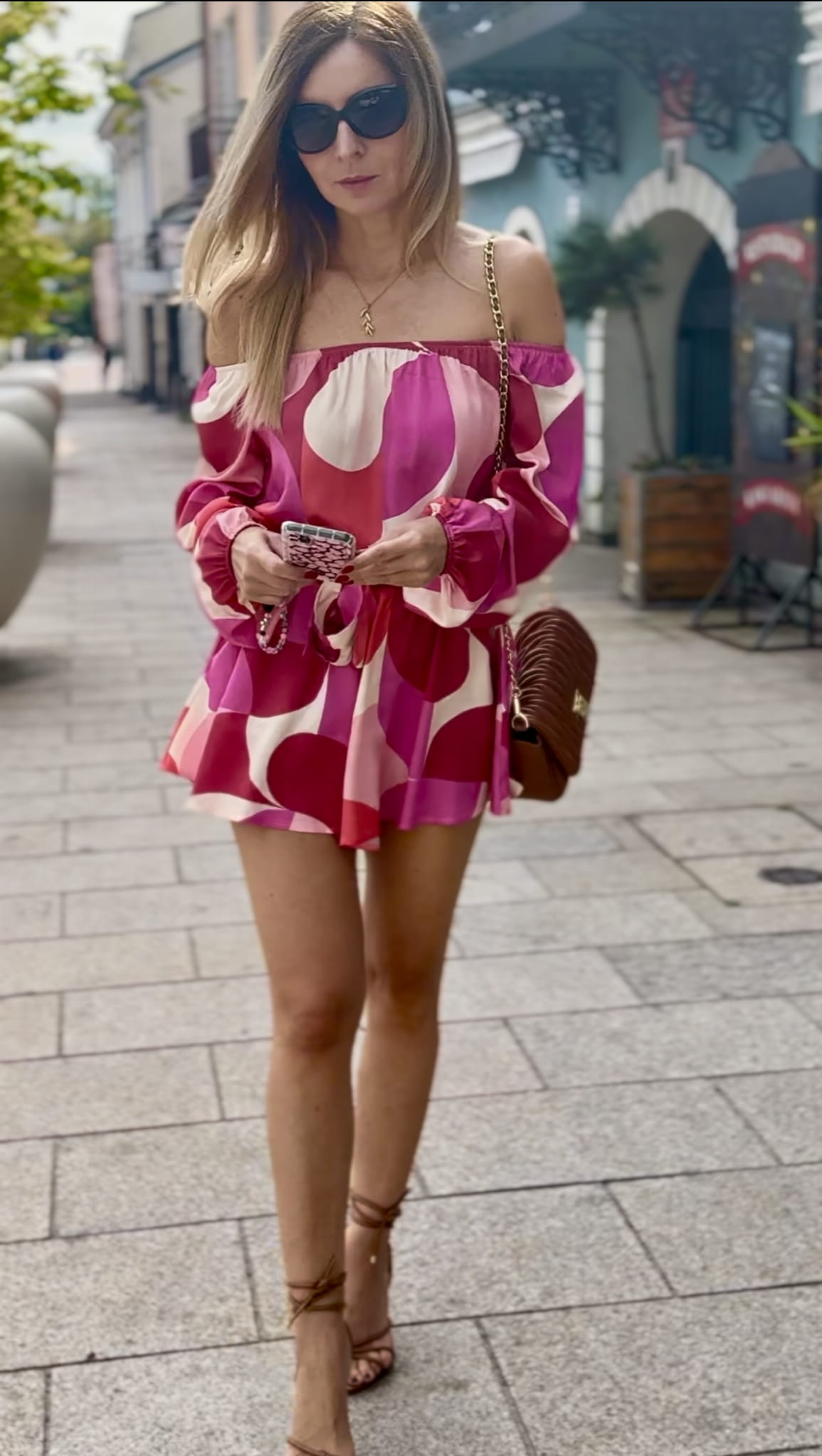 Komplet damski bluzka hiszpanka rozkloszowane spodenki Costa Satyna Różowe Koła 100% wiskoza