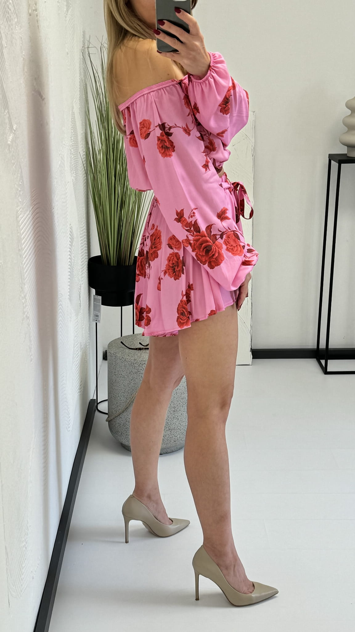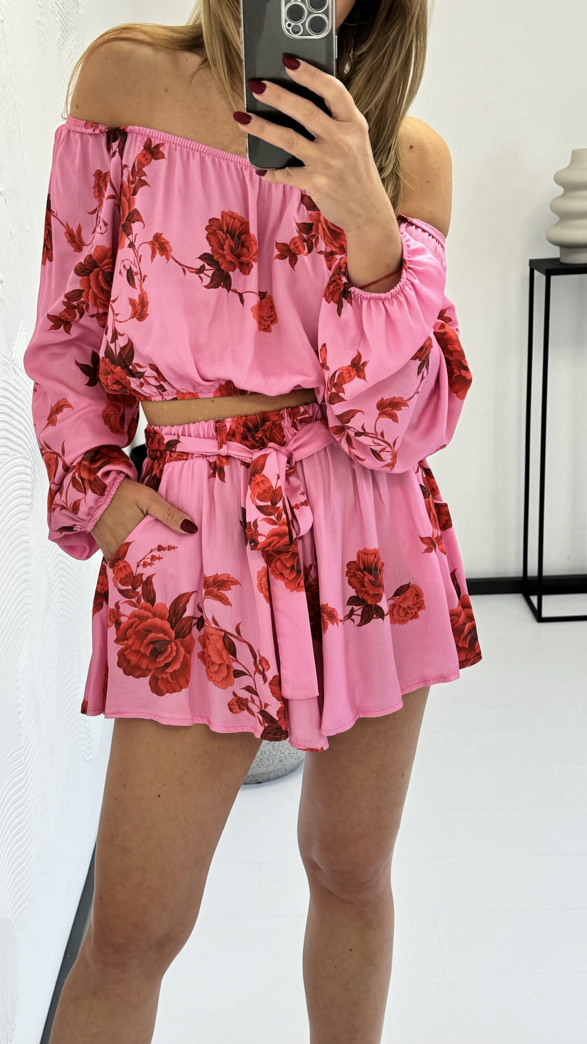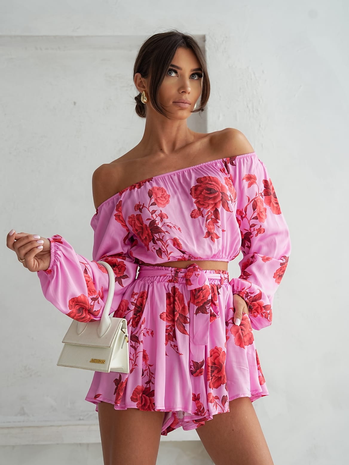 Komplet damski wiskoza bluzka Hiszpanka oraz rozkloszowane spodenki Costa Satyna Czerwone Róże