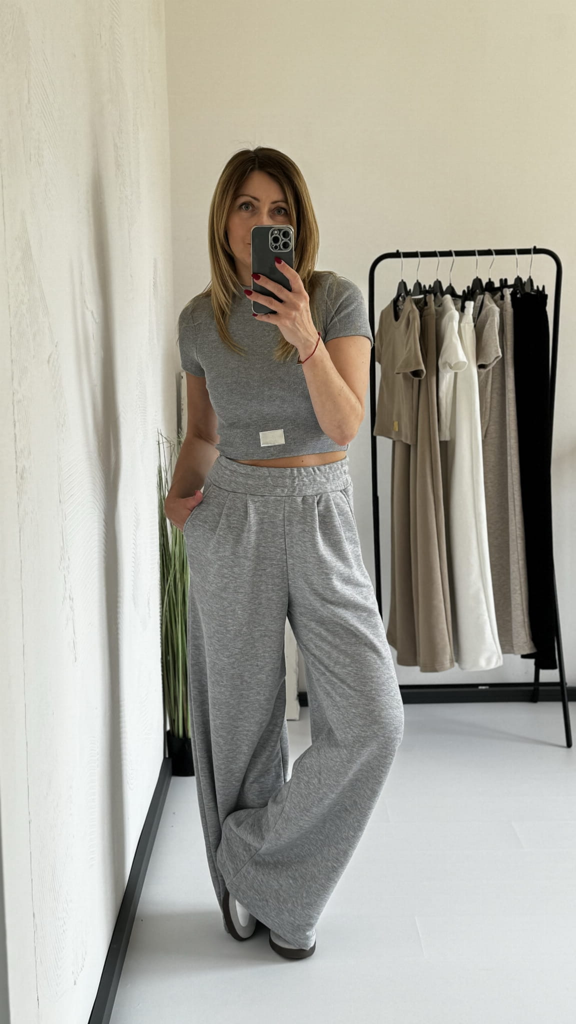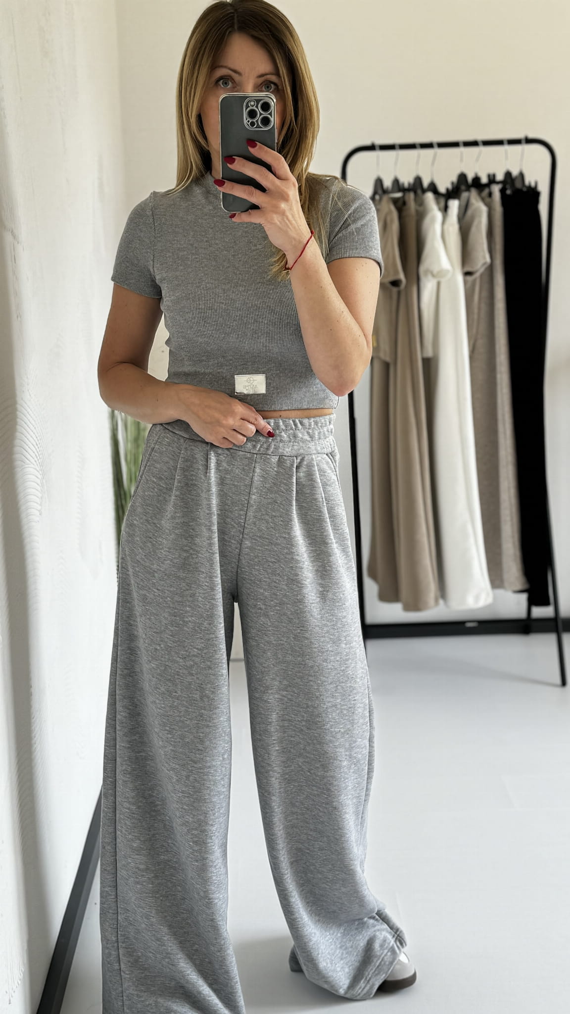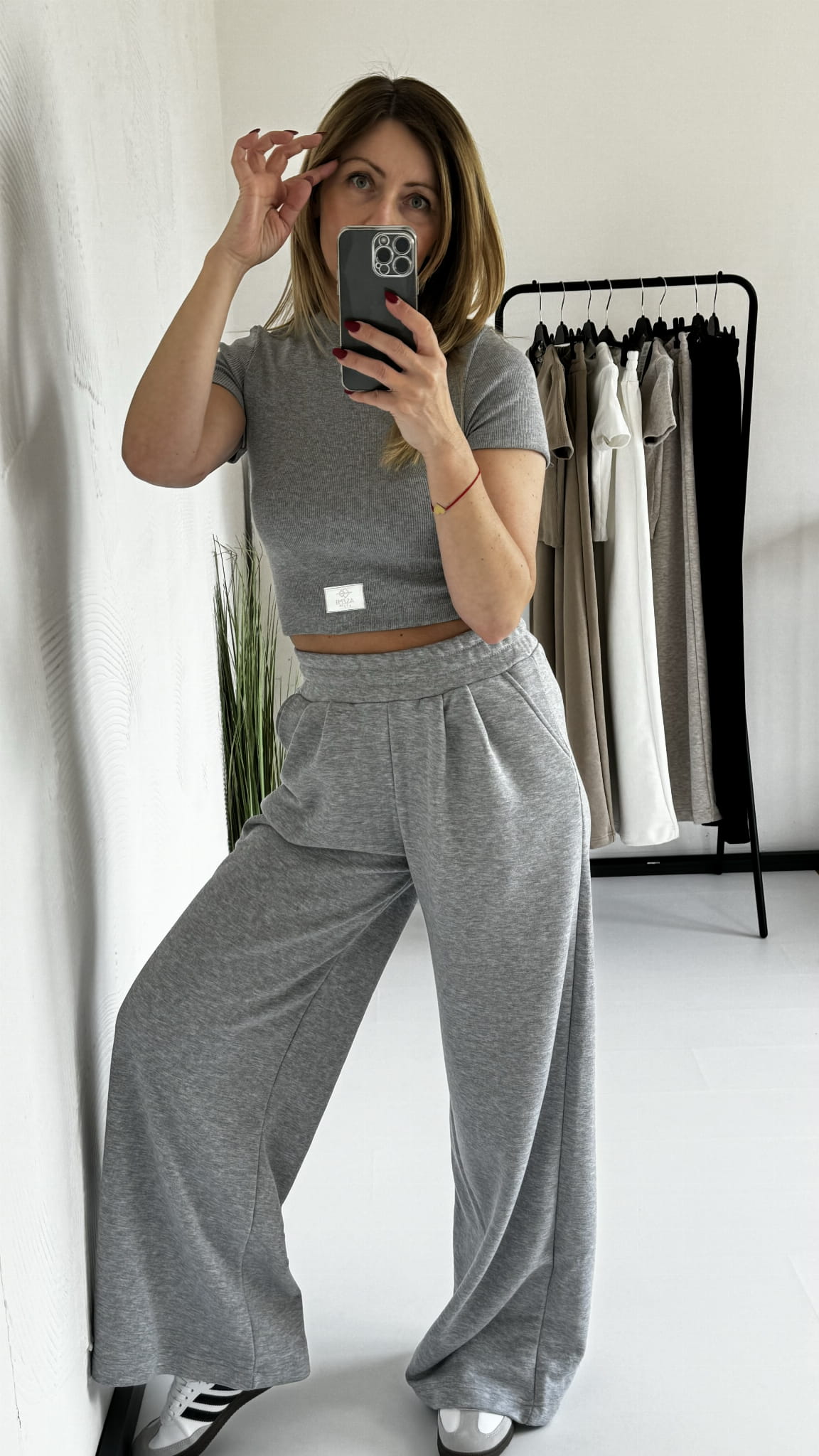 Komplet dresowy 2w1 top prążek spodnie z szeroką nogawką Cube Szary Melanż
