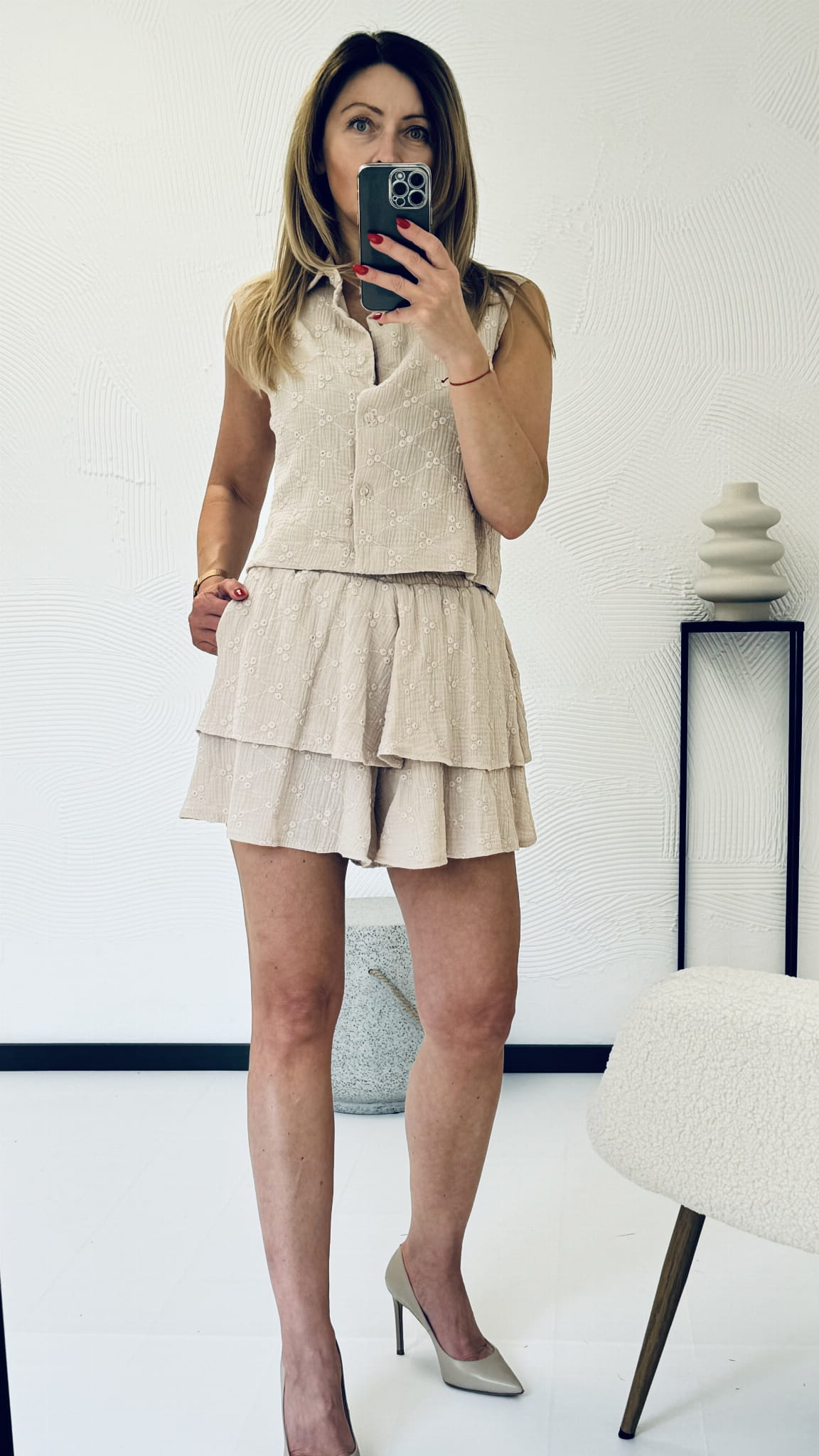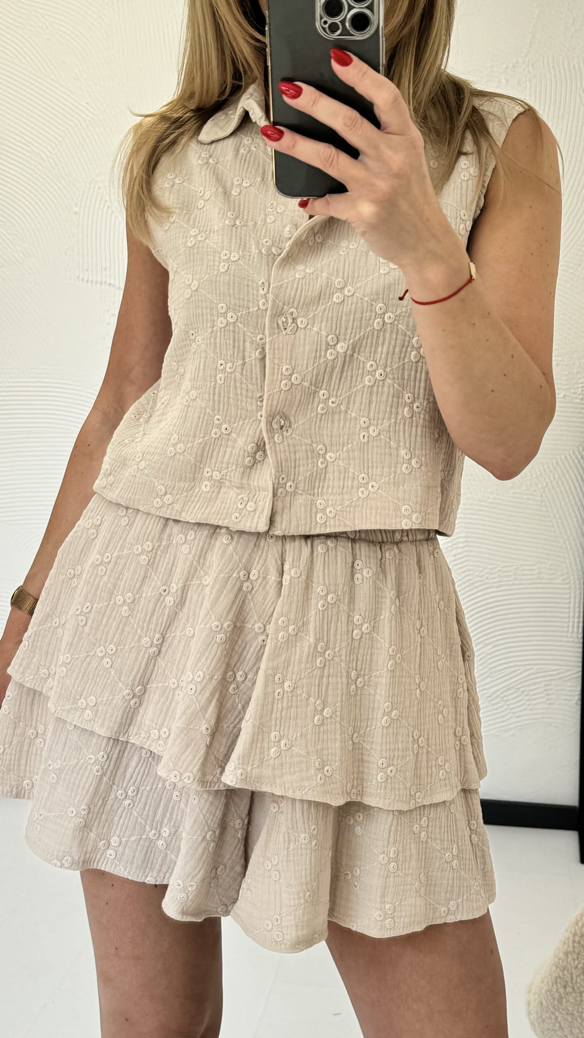 Komplet muślinowy Hawai Haft Beżowy 100 % bawełna bluzka bez rękawów oraz spódnico-spodenki