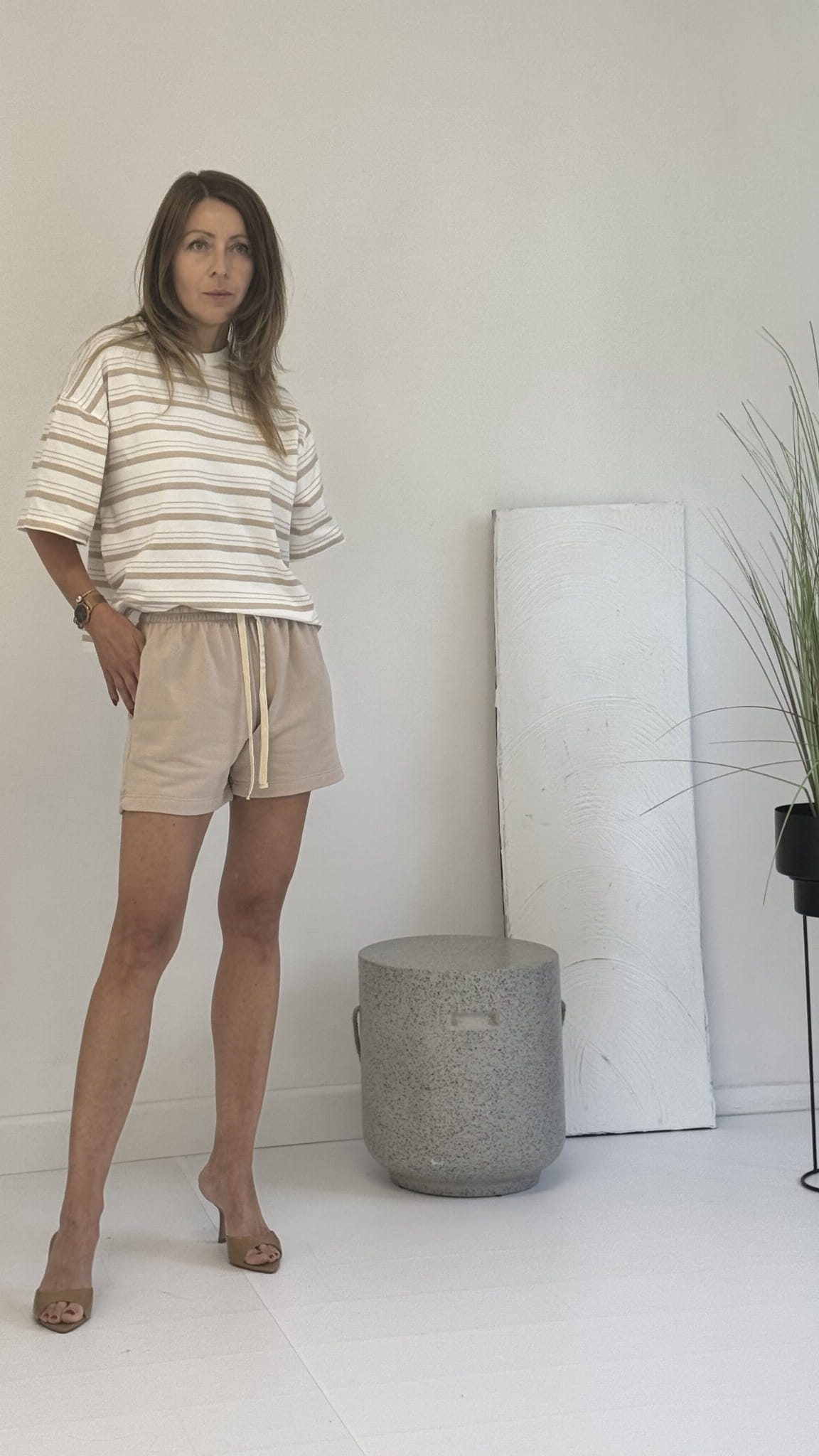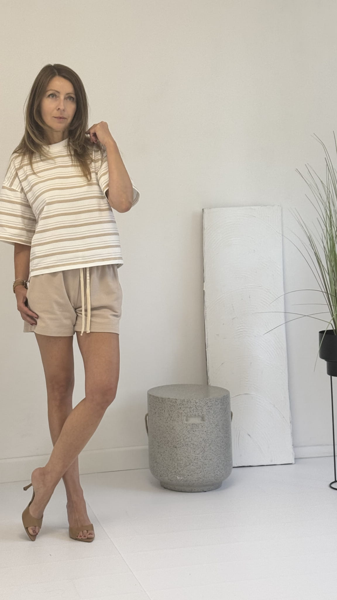 T-shirt typu pudełko paseczki oversize oraz spodenki z kieszeniami wewnętrznymi .Basicowy fason .
