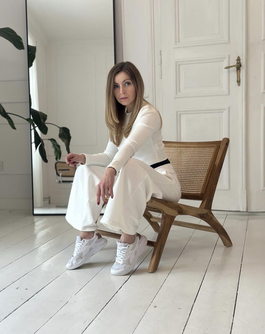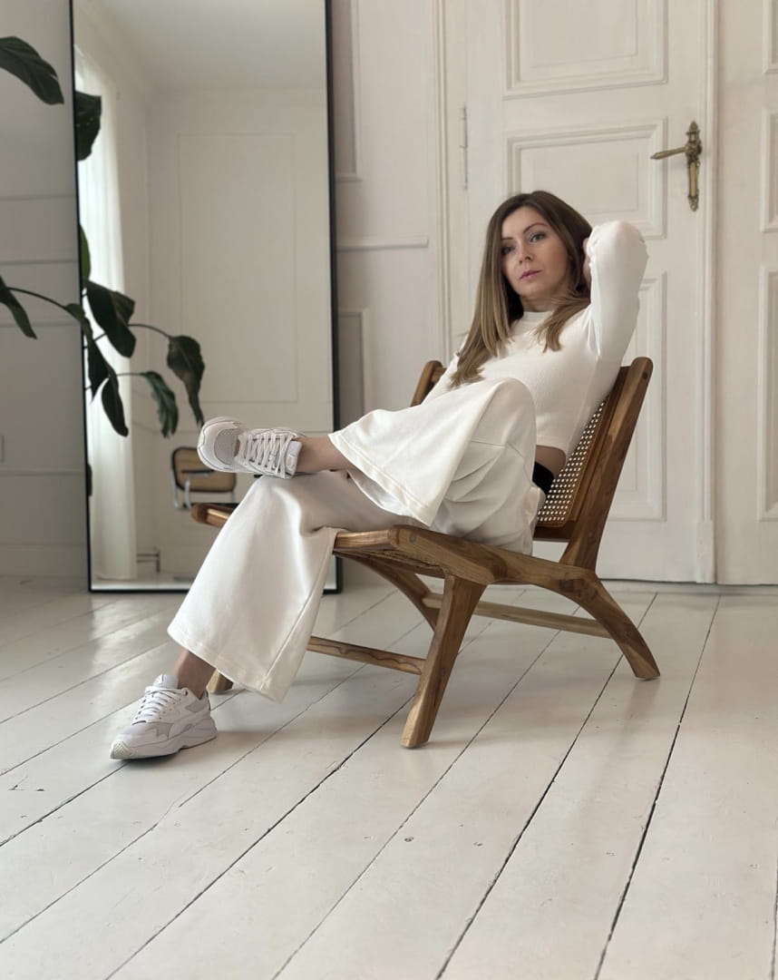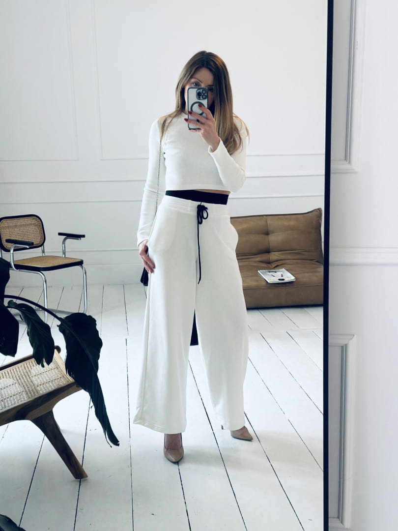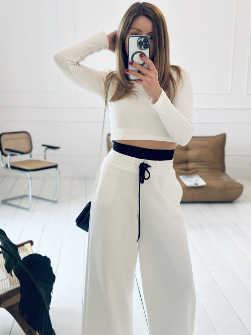 Komplet Coco to Set dla kobiet ceniących sobie swobodę oaz ekstrawagancję .Dopasowany top z prążkowanej elastycznej bawełny z elastanem dodaje szerokim spodniom z wysokim stanem sexapilu . Spodnie dresowe z wewnętrznymi kieszeniami .
