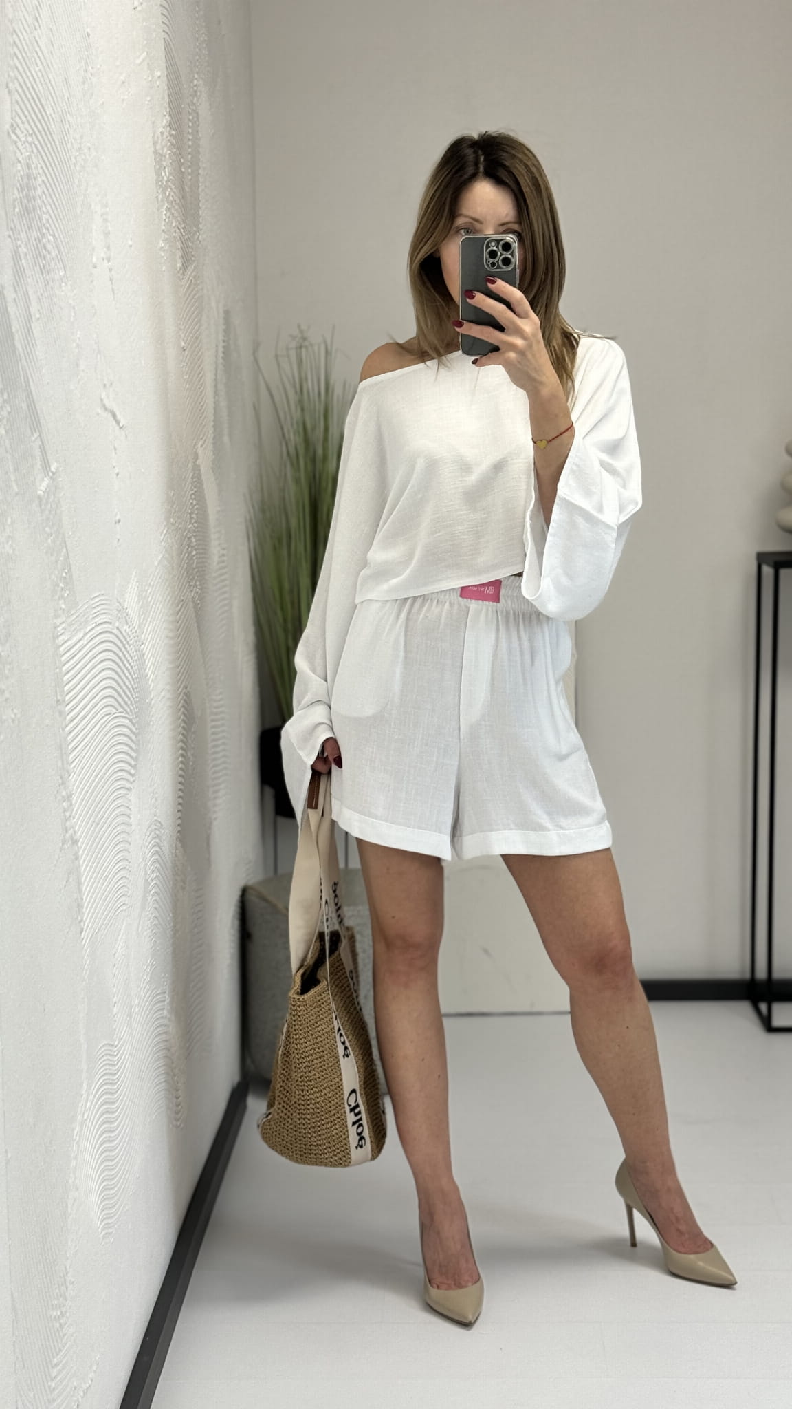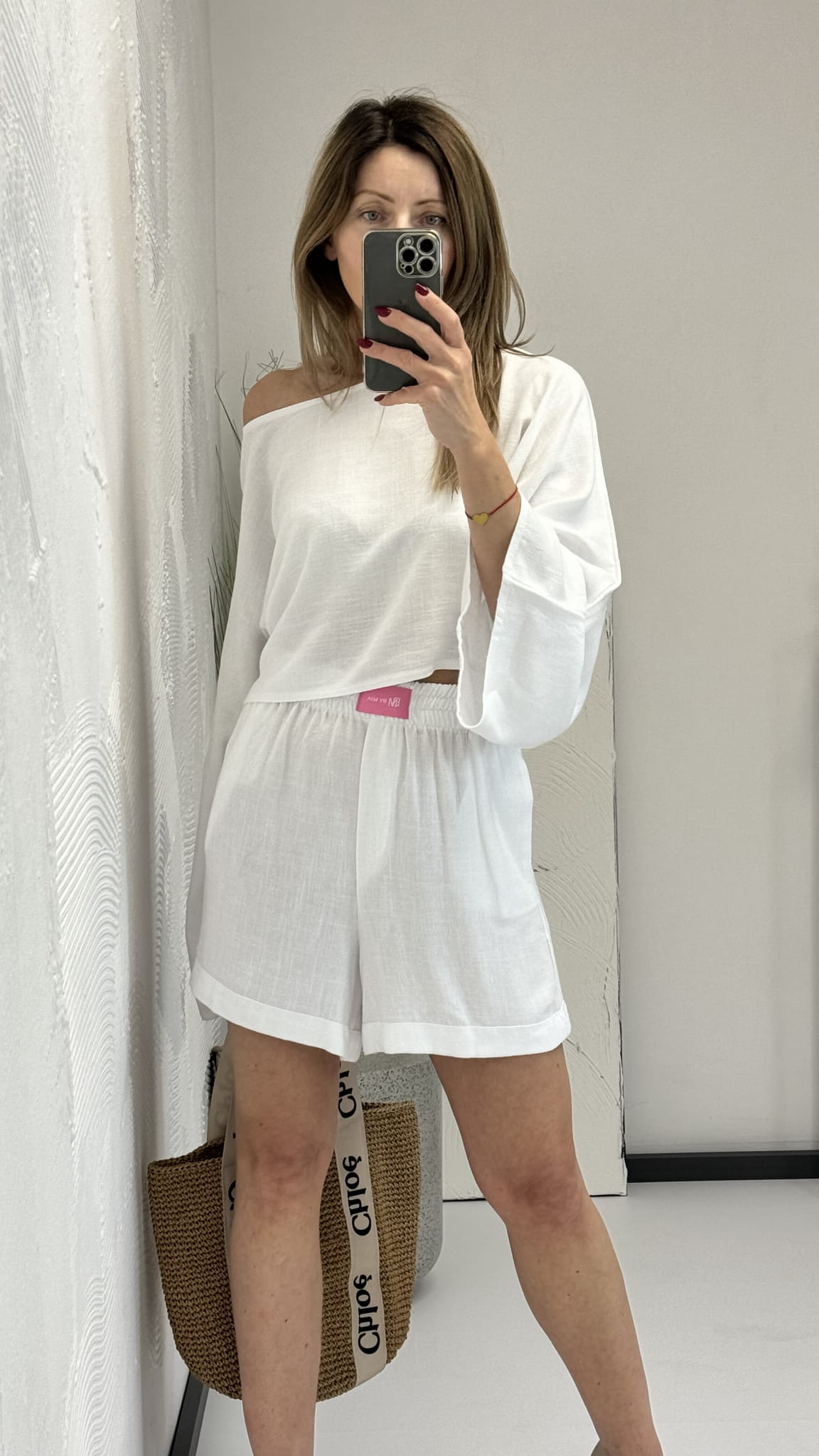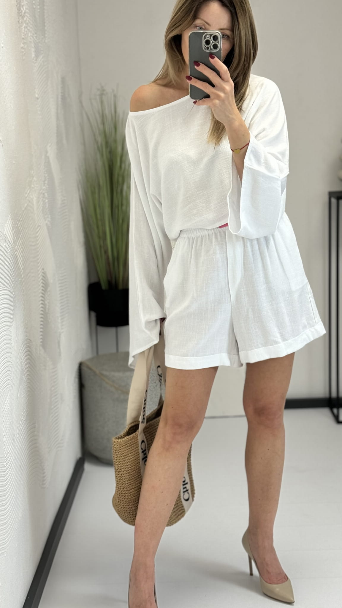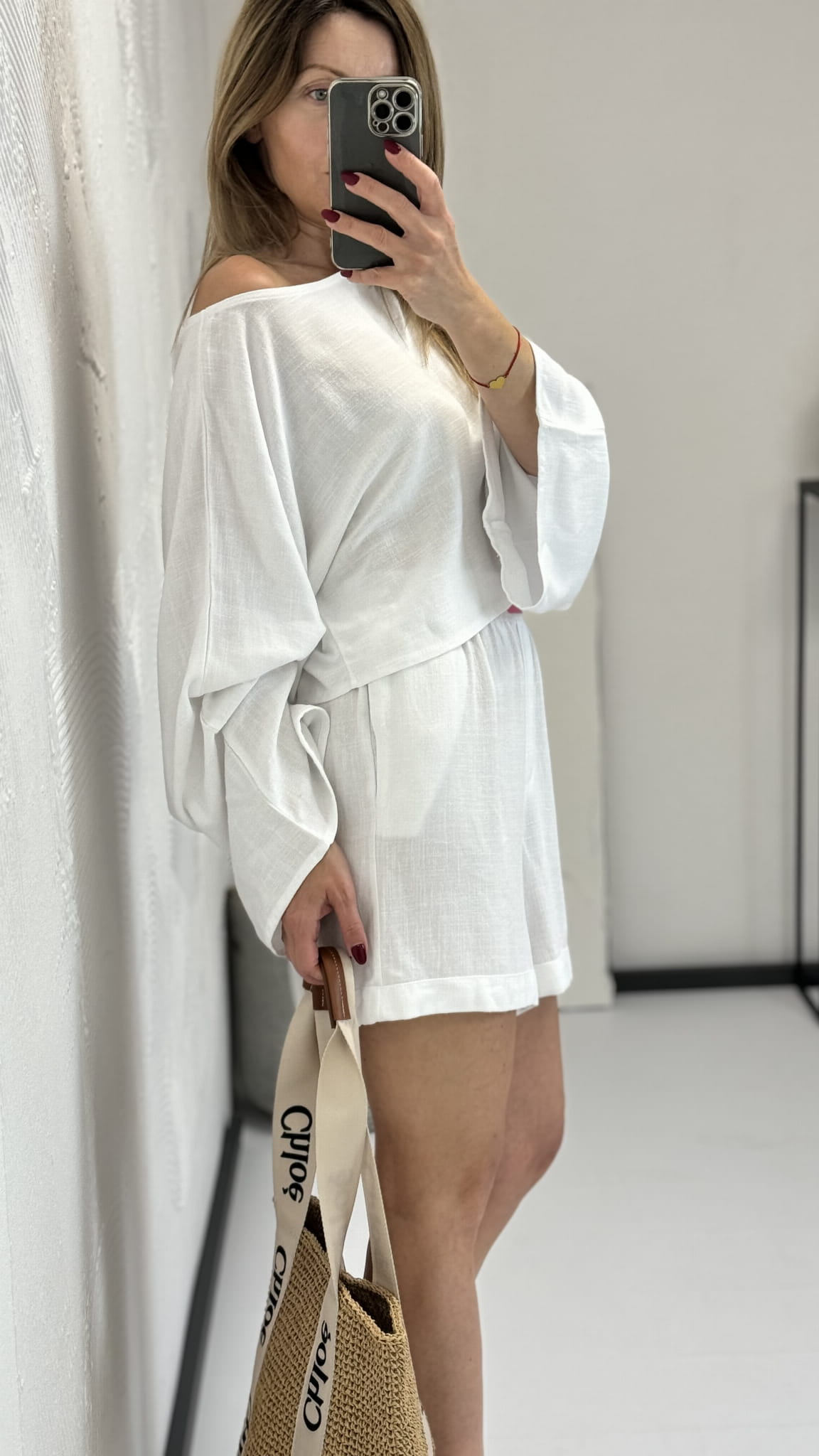 Lniany komplet Monaco bluzka kimono z rozszerzonym rękawem oraz dłuższe spodenki - By Mia