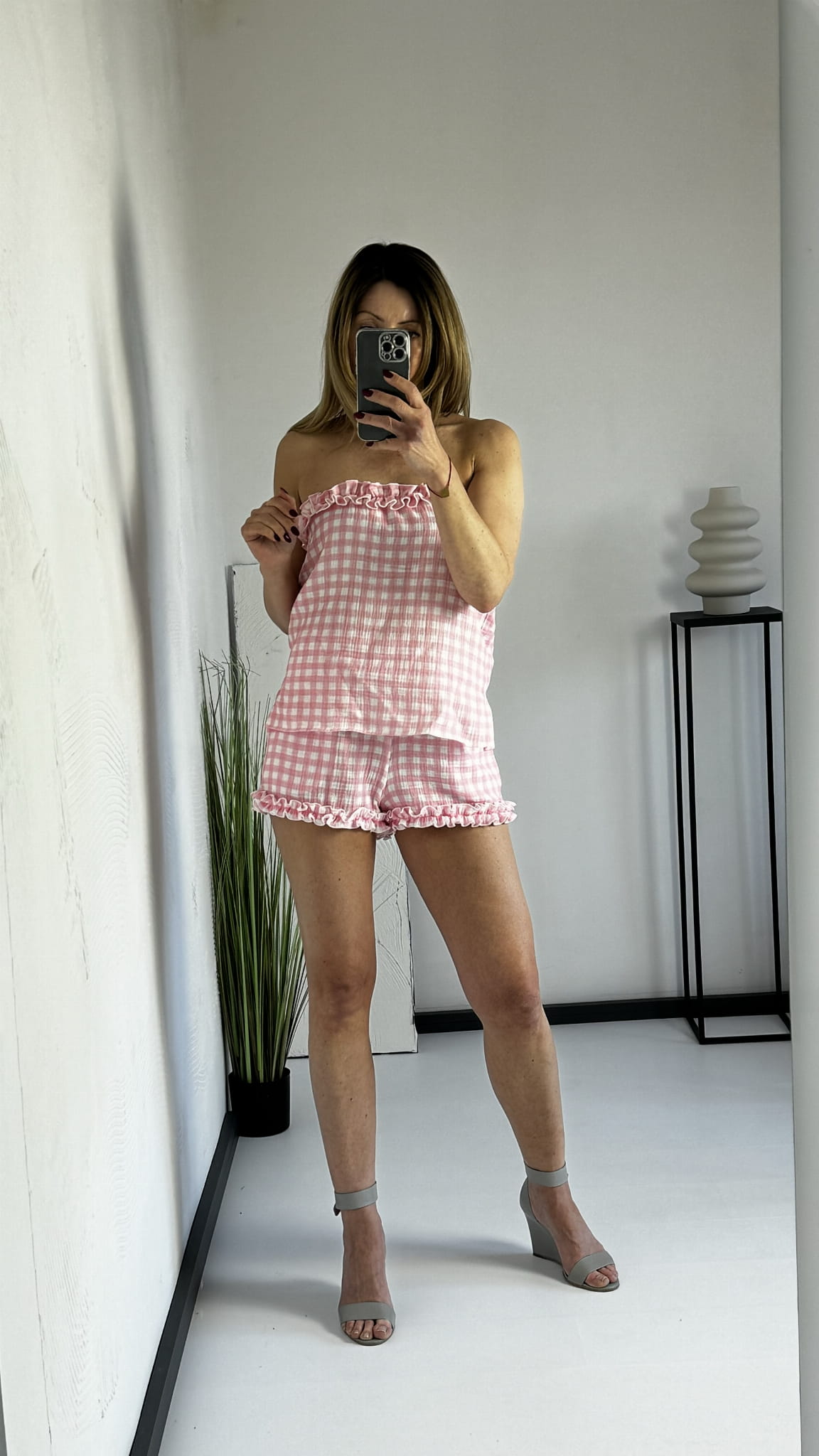 Wykonanie z miłej tkaniny, połączenie topu bez ramiączek na gumce oraz spodenek.
