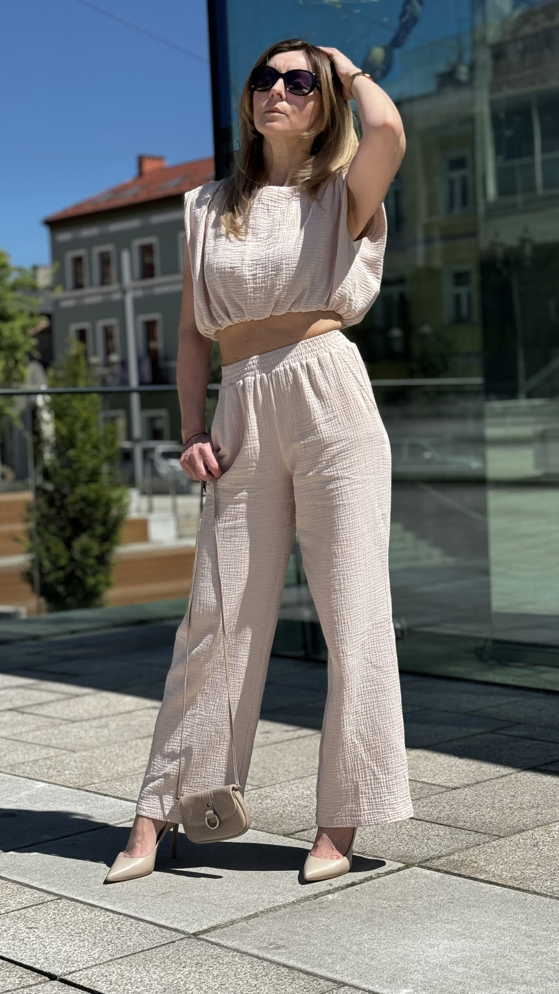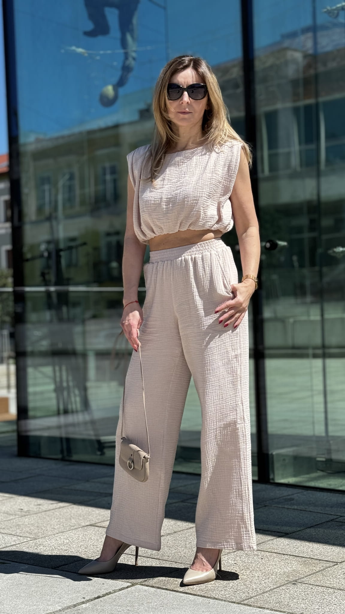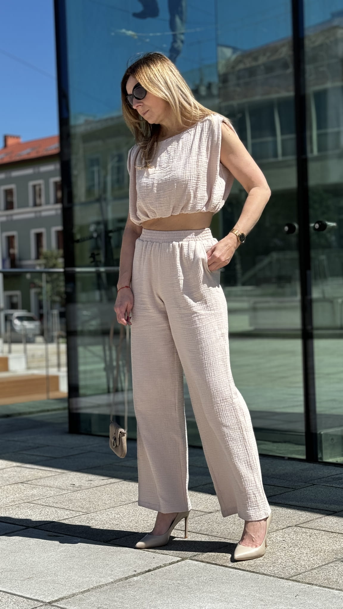 Wykonanie z miłej tkaniny, połączenie topu krótszego z podwójnej muśliny oraz długich spodni na gumce w pasie z kieszeniami wewnętrznymi .