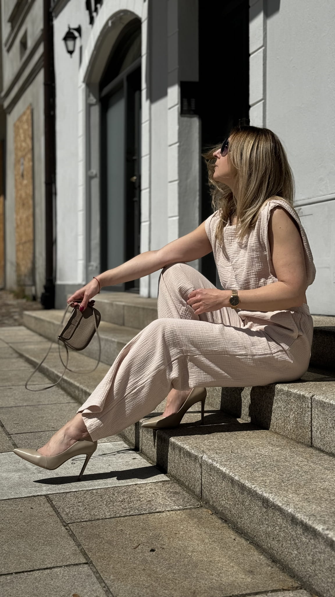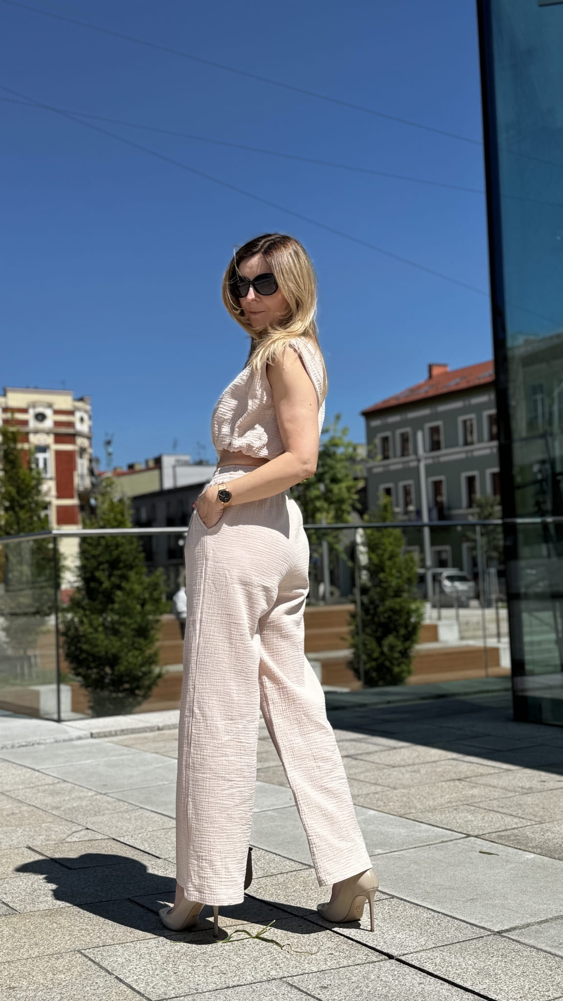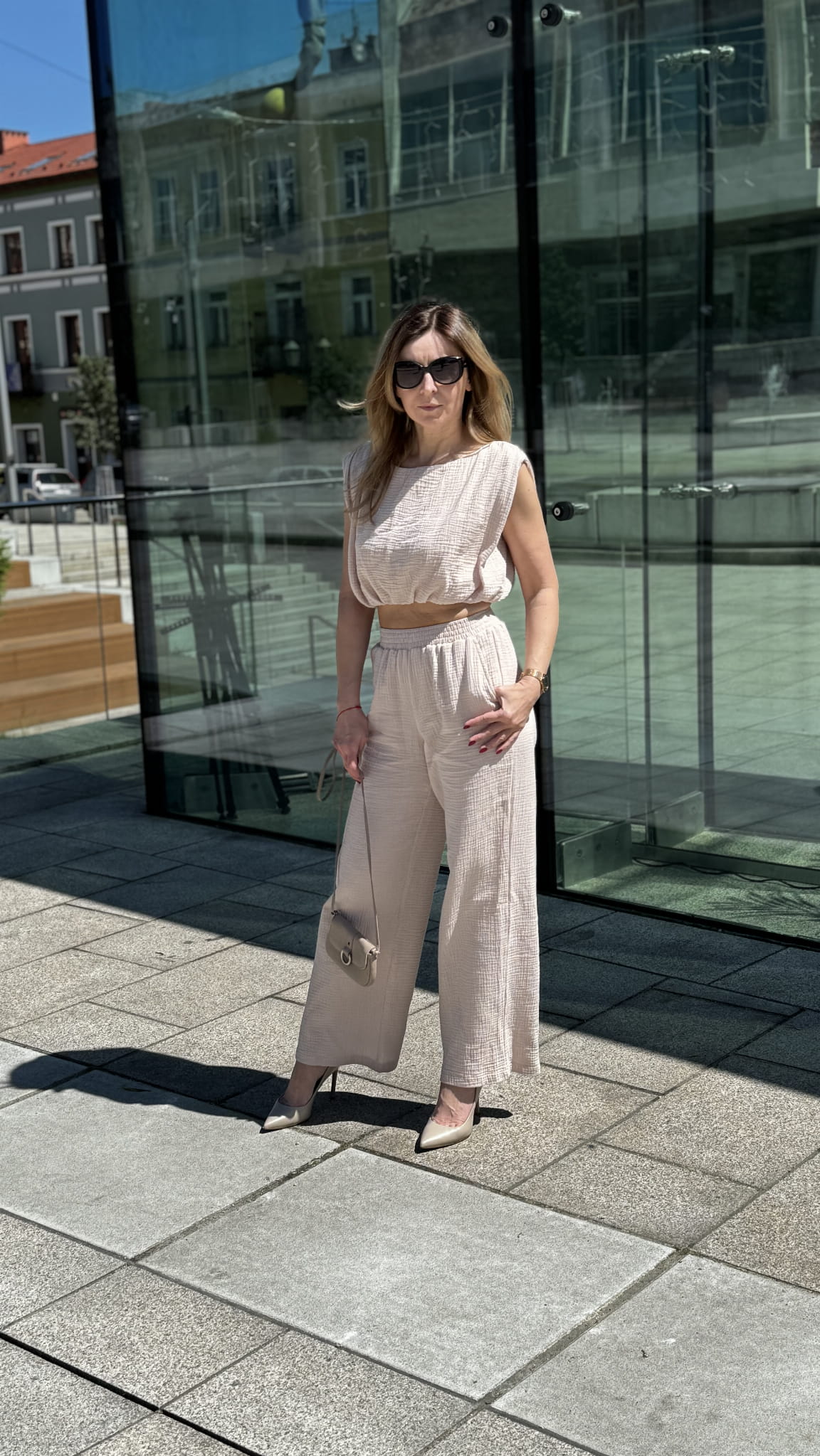 Wykonanie z miłej tkaniny, połączenie topu krótszego z podwójnej muśliny oraz długich spodni na gumce w pasie z kieszeniami wewnętrznymi .