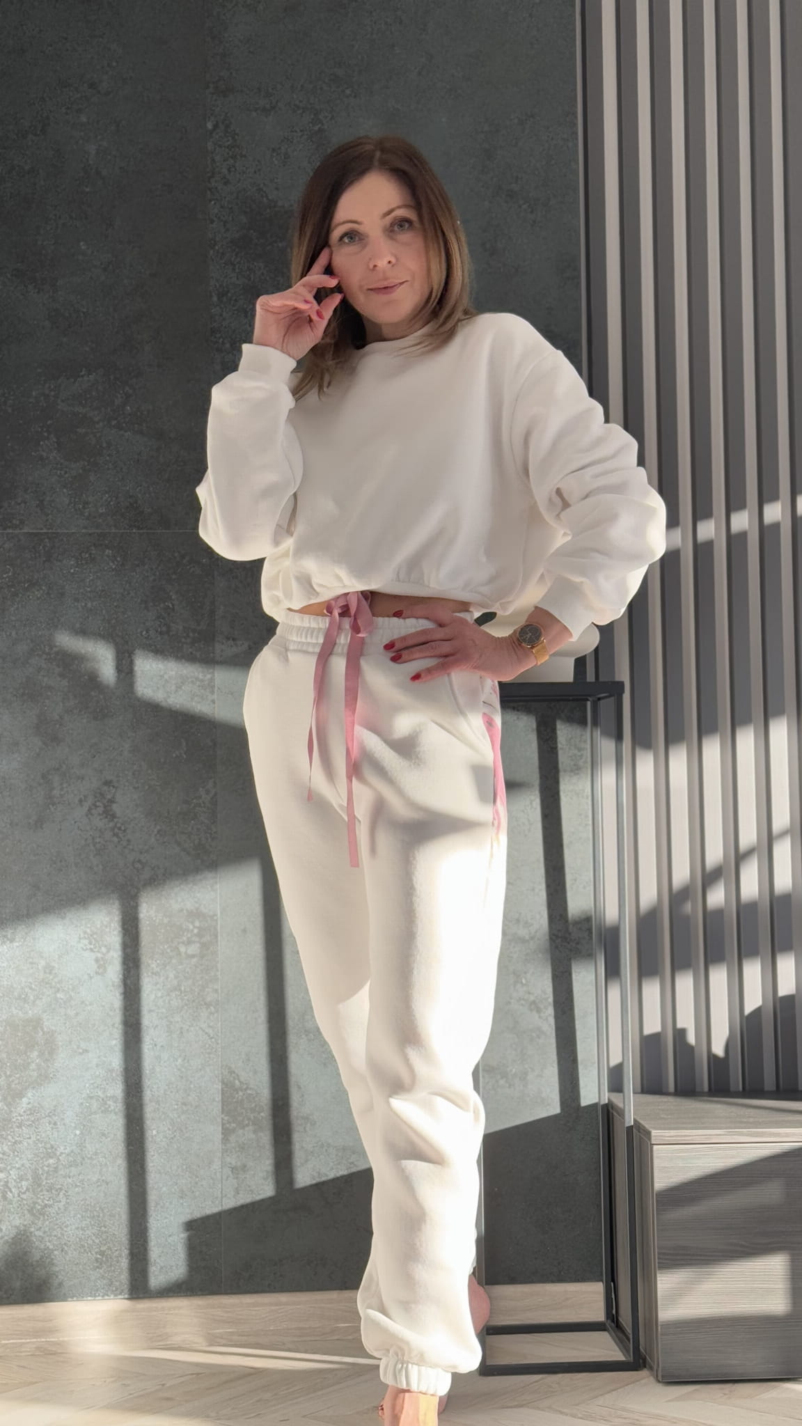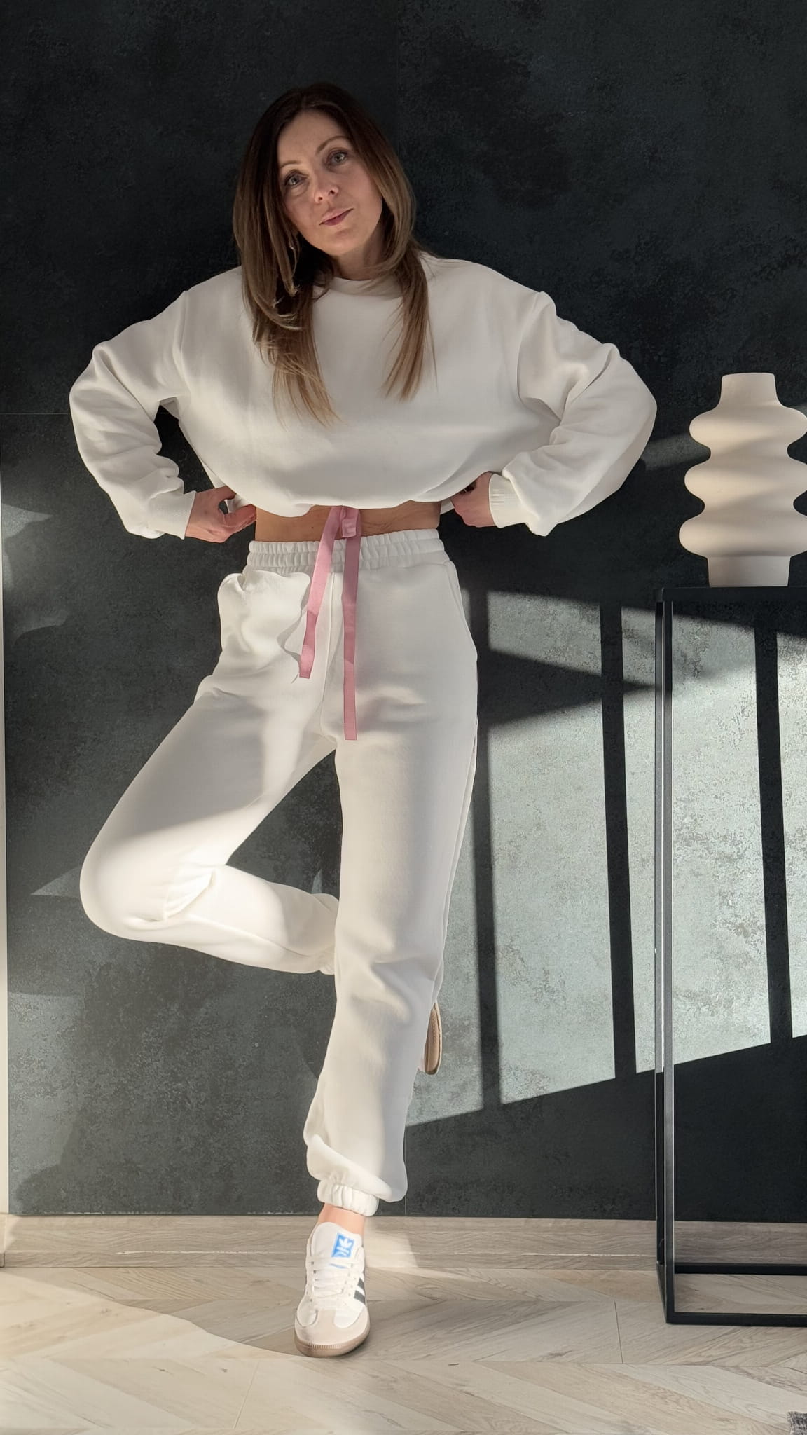 Komplet dresowy Sweet 2w1 to zestawienie ocieplanej bluzy ze spodniami dresowymi z wysokim stanem . Spodnie ocieplane z kieszeniami wewnętrznymi . Bluza oversizowy krój z regulowanym ściągaczem tasiemką .