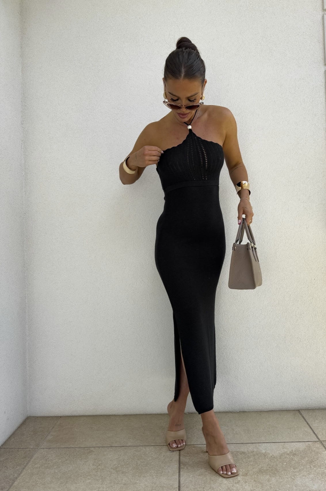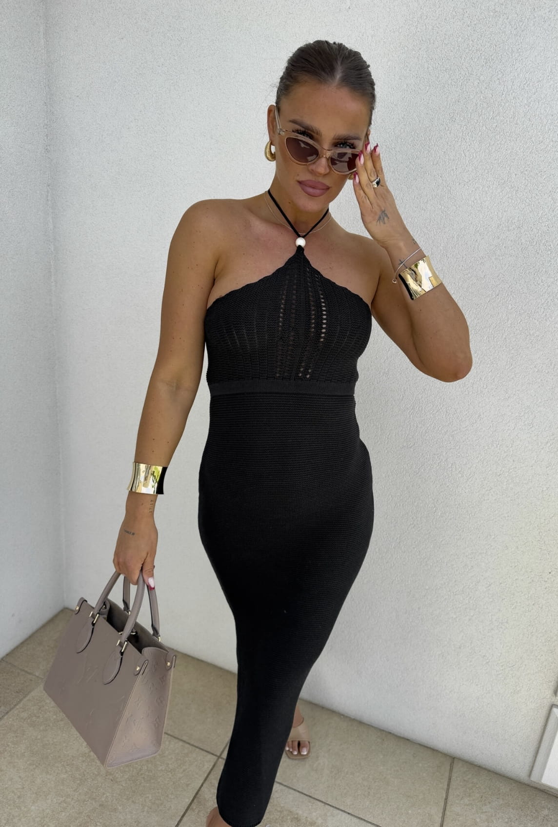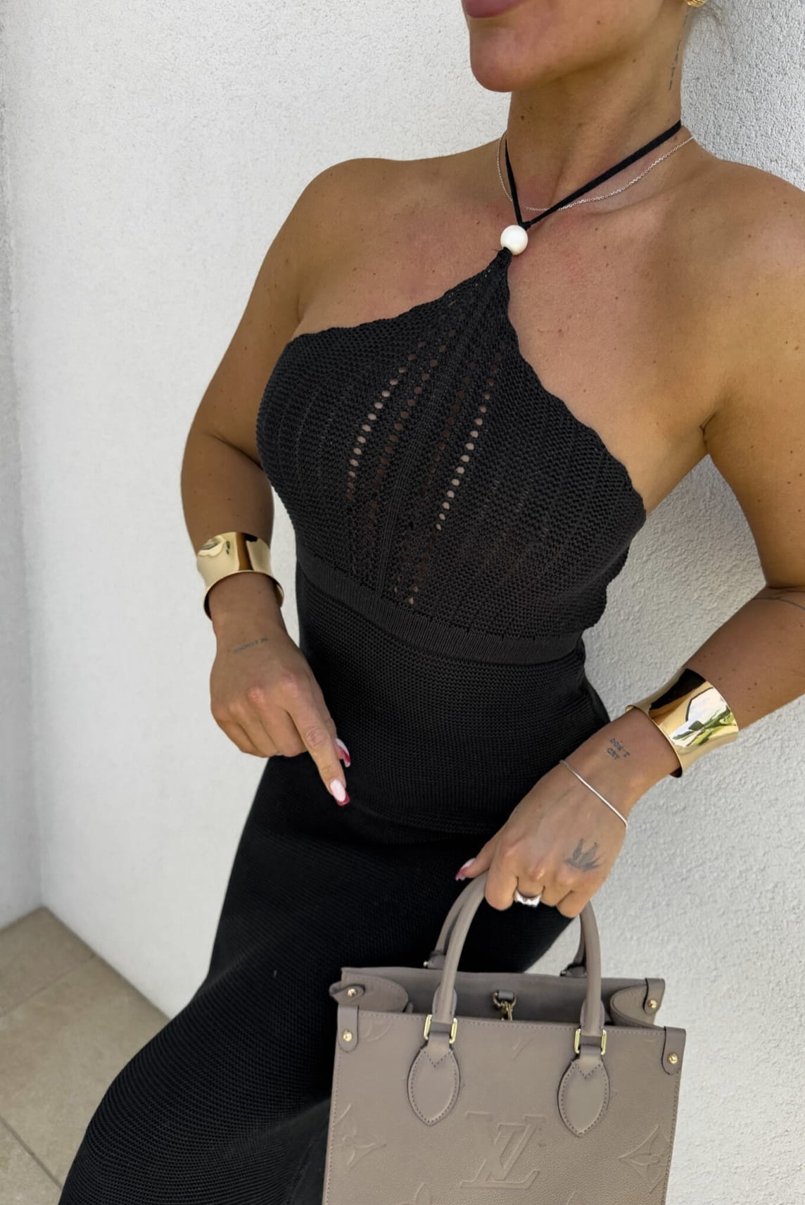 Elegancka sukienka maxi to idealny wybór na letnie przyjęcia, romantyczne kolacje czy wakacyjne spacery. Model z wiązaniem na szyi ozdobiony subtelną perełką nad biustem dodaje całości kobiecego uroku i delikatności. Gumka pod biustem pięknie podkreśla talię, zapewniając jednocześnie komfort noszenia. Lekki, zwiewny materiał oraz efektowne rozcięcie z boku nadają sukience lekkości i zmysłowego charakteru.