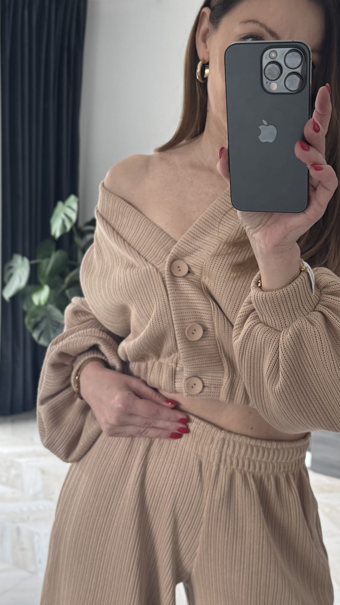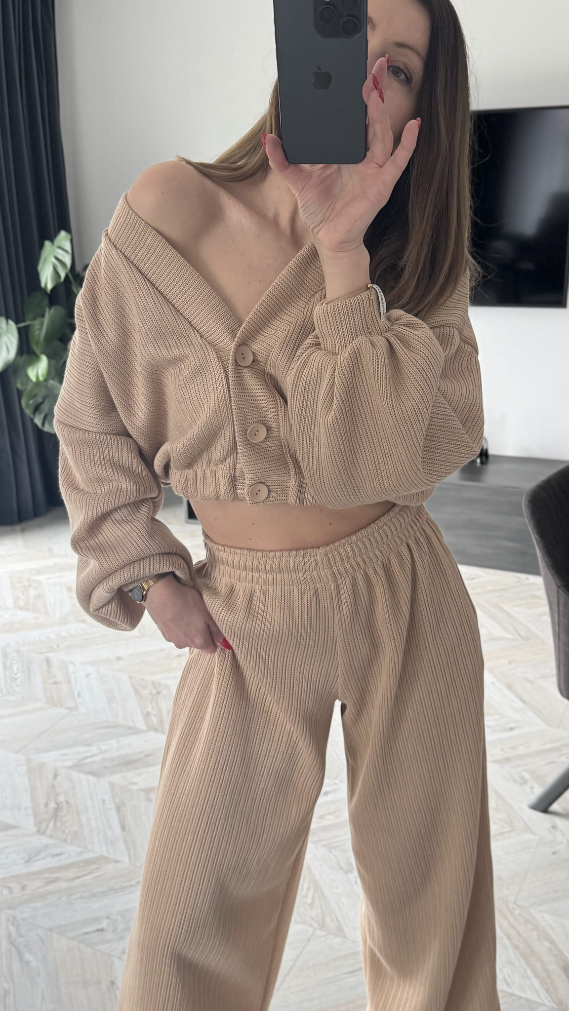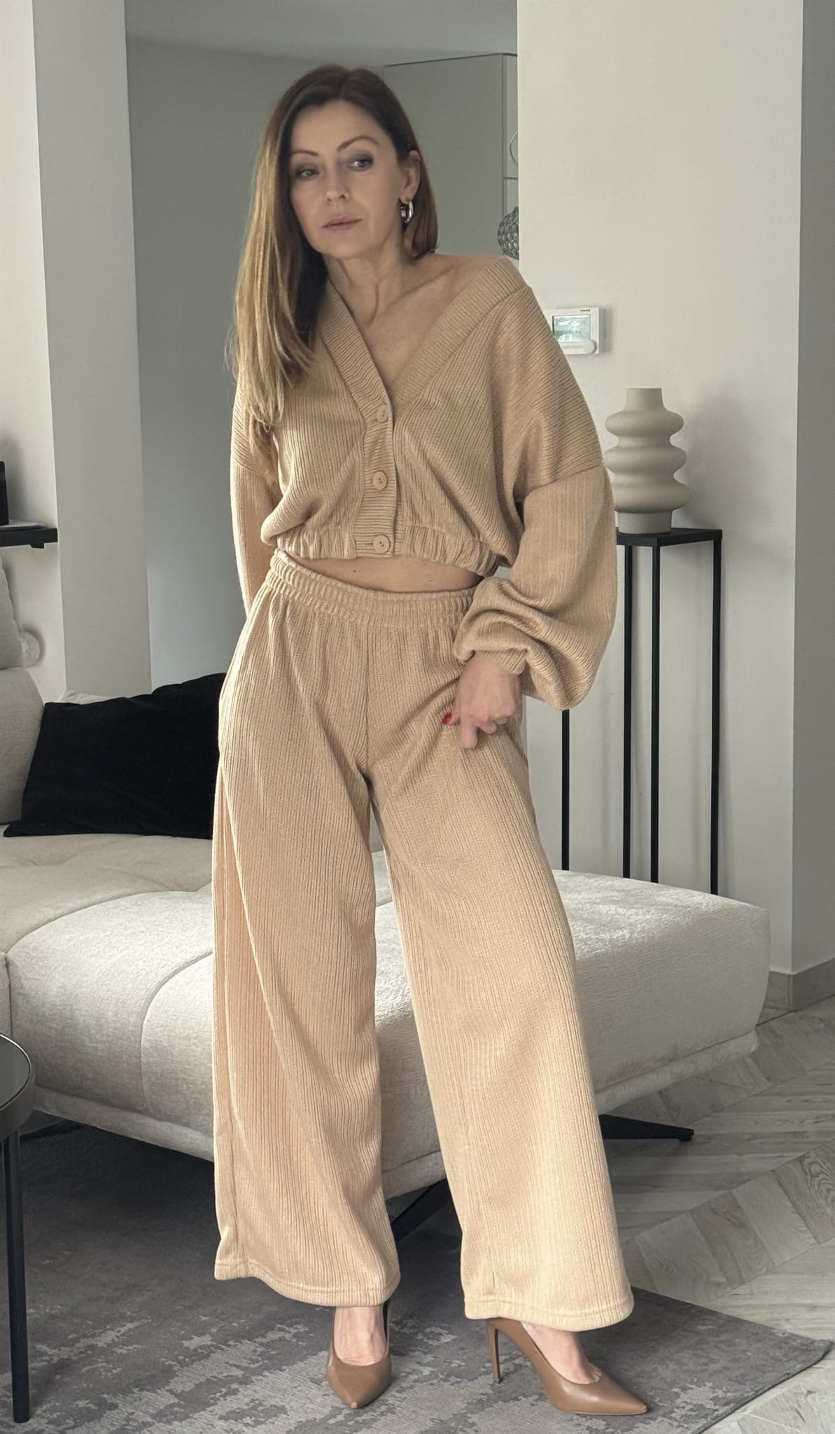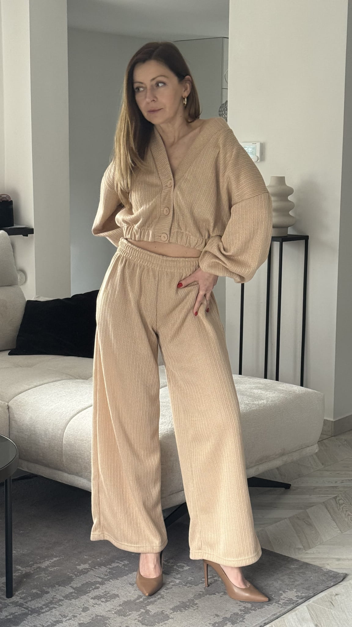Komplet dzianinowy spodnie z wysokim stanem oraz sweterek zapinany na ozdobne guziki . Dół sweterka wykończony ściągaczem w rozmiarze oversize. Bluza typu Basic posiada regulowany troczek . Komplet z mięciutkiego , przynajmnego materiału .